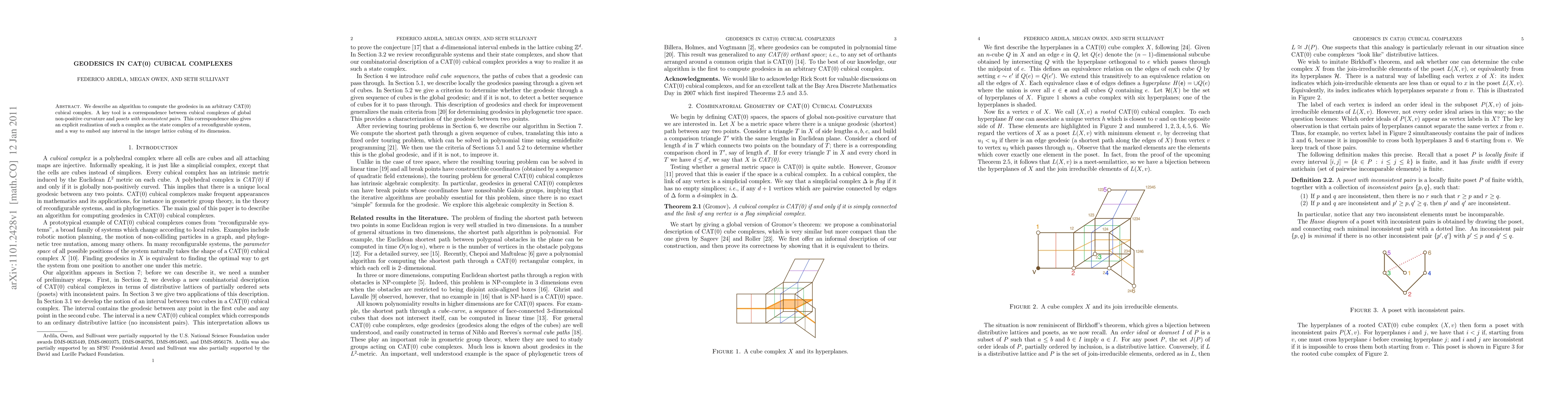 Summary: The paper presents an algorithm to determine geodesics in CAT(0) cubical complexes, leveraging a correspondence between such complexes and posets with inconsistent pairs, which also facilitates their representation as state complexes of reconfigurable systems.