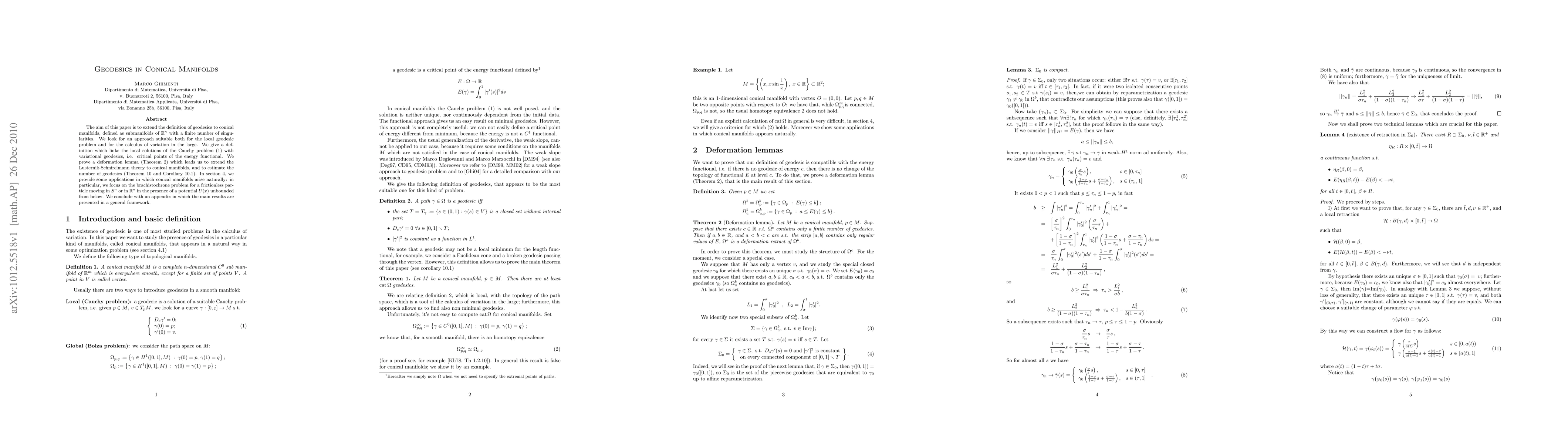 This paper extends the concept of geodesics to conical manifolds, which are submanifolds of $\R^n$ with singularities, and proposes a method applicable to both local geodesic problems and large-scale calculus of variation.