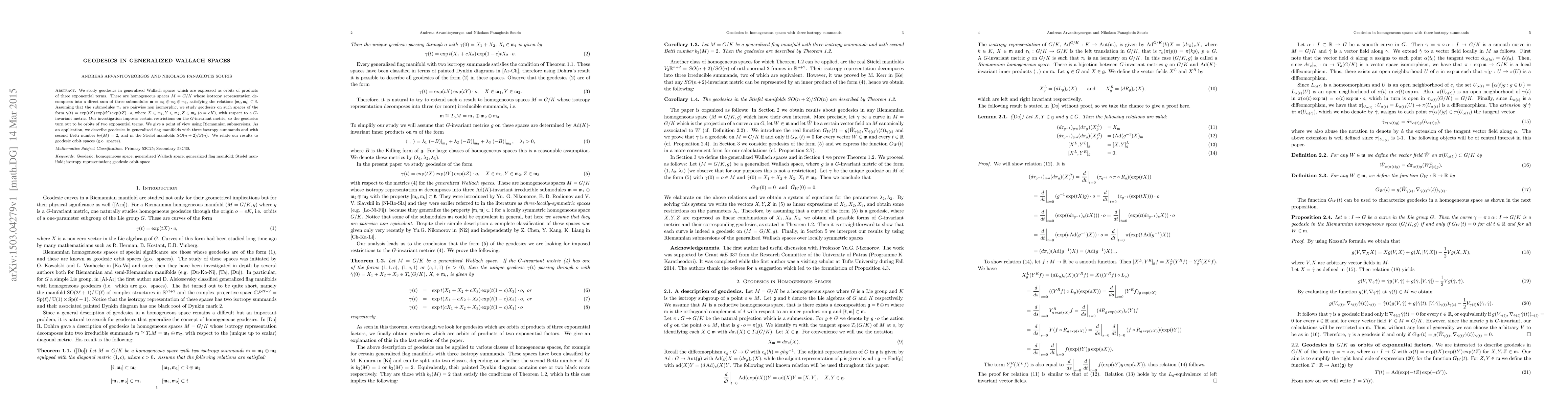 This paper investigates geodesics in generalized Wallach spaces, expressed as products of three exponential terms. It finds that geodesics on these homogeneous spaces, defined by a specific $G$-invariant metric, are orbits generated by two exponential terms. The study applies these findings to generalized flag manifolds and Stiefel manifolds, relating the results to geodesic orbit spaces.