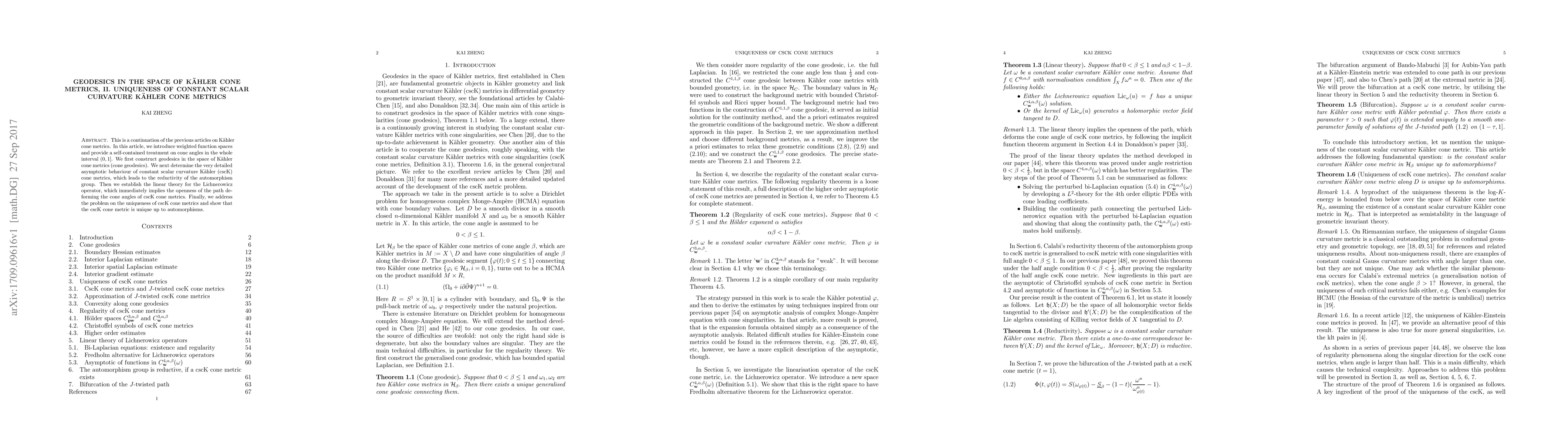 This paper continues the study of Kahler cone metrics, constructing geodesics in their space and analyzing the asymptotic behavior of constant scalar curvature metrics. It concludes by proving the uniqueness of such metrics up to automorphisms.