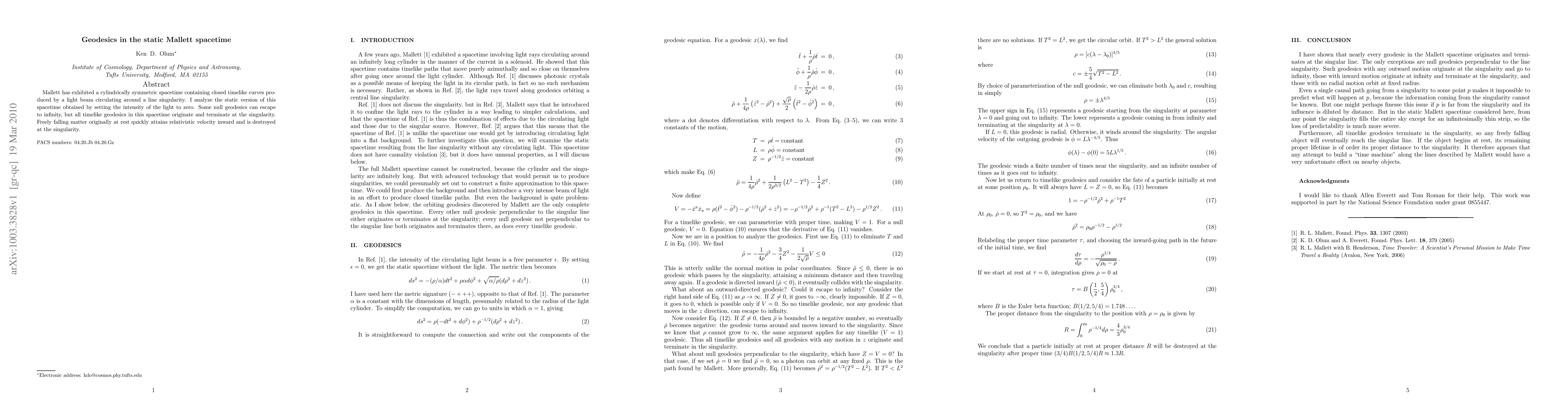This research explores the static Mallett spacetime, finding that while some null geodesics can escape to infinity, all timelike geodesics start and end at a central singularity. Matter falling freely towards the singularity rapidly accelerates to relativistic speeds and is presumed destroyed at the singularity.