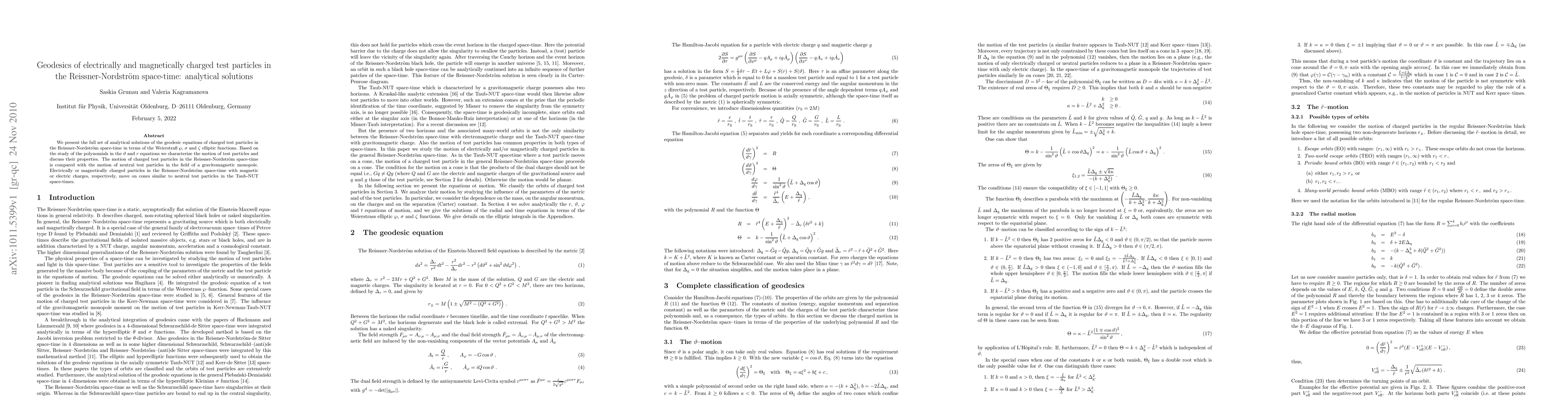 This paper provides analytical solutions for the geodesic equations of electrically and magnetically charged test particles in Reissner-Nordström space-time, using Weierstrass elliptic functions. It characterizes the motion of these particles and compares it to neutral particles in gravitomagnetic monopoles, noting similarities in their trajectories.