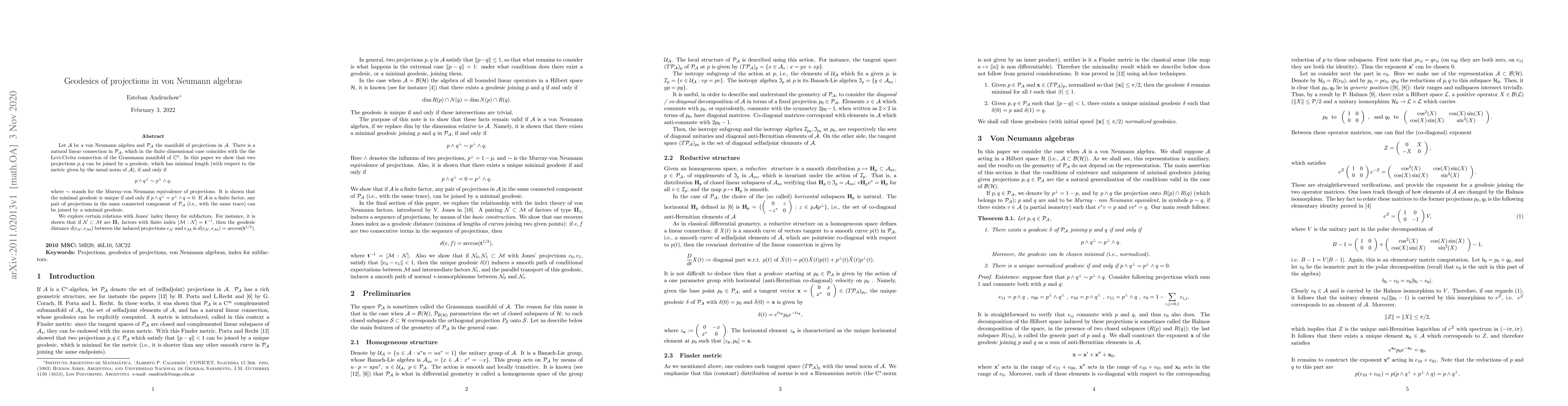 This paper explores geodesics of projections in von Neumann algebras, showing that two projections can be joined by a minimal geodesic if and only if they are Murray-von Neumann equivalent or part of the same connected component with the same trace.