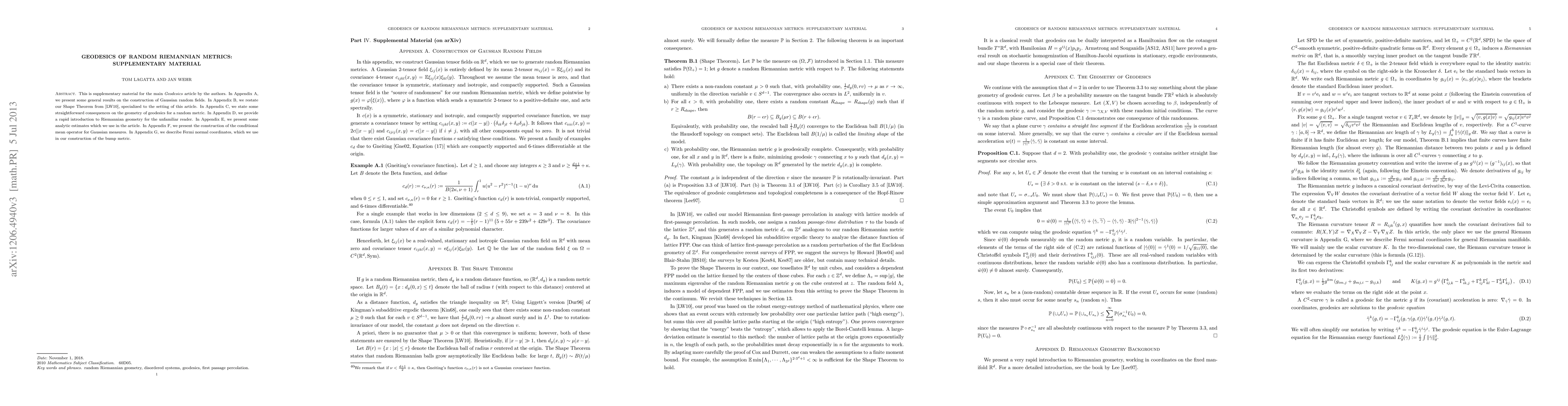 This is supplementary material for the main Geodesics article by the authors. In Appendix A, we present some general results on the construction of Gaussian random fields. In Appendix B, we restate our Shape Theorem, specialized to the setting of this article. In Appendix C, we state some straightforward consequences on the geometry of geodesics for a random metric. In Appendix D, we provide a rapid introduction to Riemannian geometry for the unfamiliar reader. In Appendix E, we present some analytic estimates which we use in the article. In Appendix F, we present the construction of the conditional mean operator for Gaussian measures. In Appendix G, we describe Fermi normal coordinates, which we use in our construction of the bump metric.