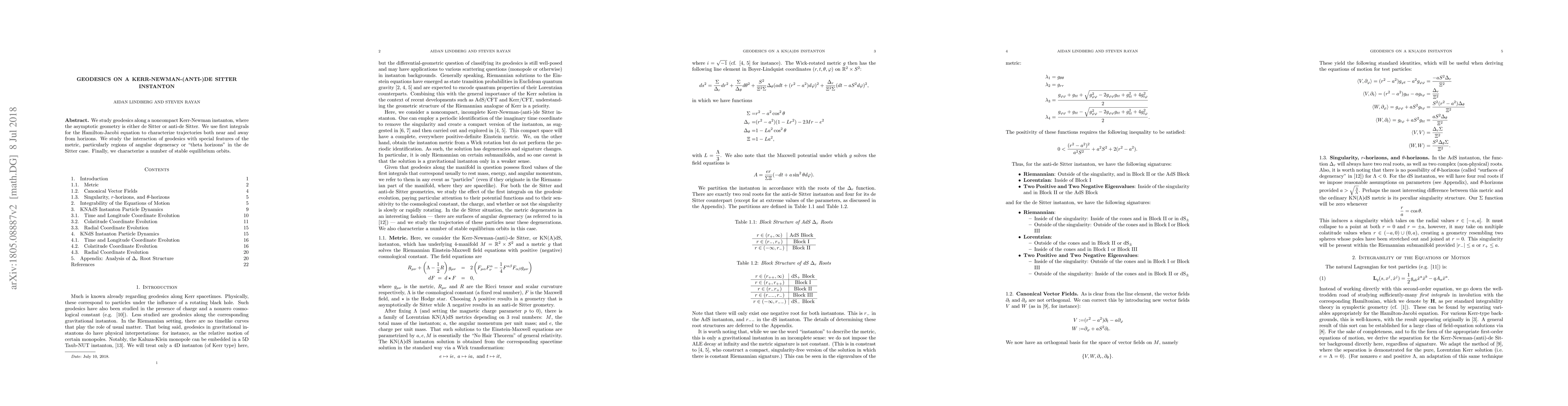 We study geodesics along a noncompact Kerr-Newman instanton, where the asymptotic geometry is either de Sitter or anti-de Sitter. We use first integrals for the Hamilton-Jacobi equation to characterize trajectories both near and away from horizons. We study the interaction of geodesics with special features of the metric, particularly regions of angular degeneracy or "theta horizons" in the de Sitter case. Finally, we characterize a number of stable equilibrium orbits.