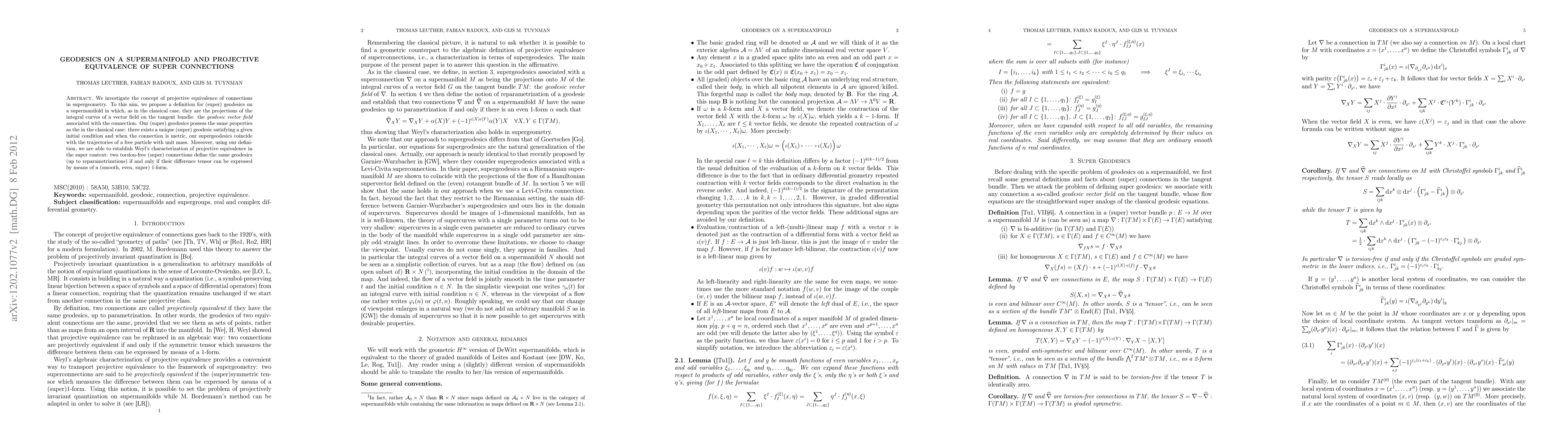 This paper defines (super) geodesics on a supermanifold and explores projective equivalence of super connections. It establishes that super geodesics maintain classical properties and uses this definition to characterize projective equivalence in supergeometry.