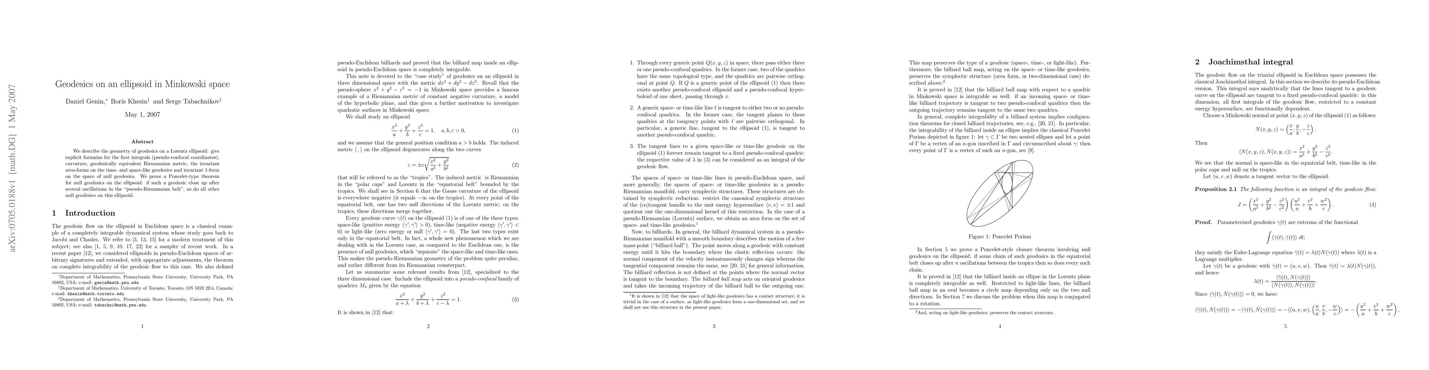 This paper provides detailed geometric analysis of geodesics on a Lorentz ellipsoid in Minkowski space, including explicit formulas for first integrals, curvature, and a Poncelet-type theorem for null geodesics, demonstrating that if one null geodesic closes, so do all.