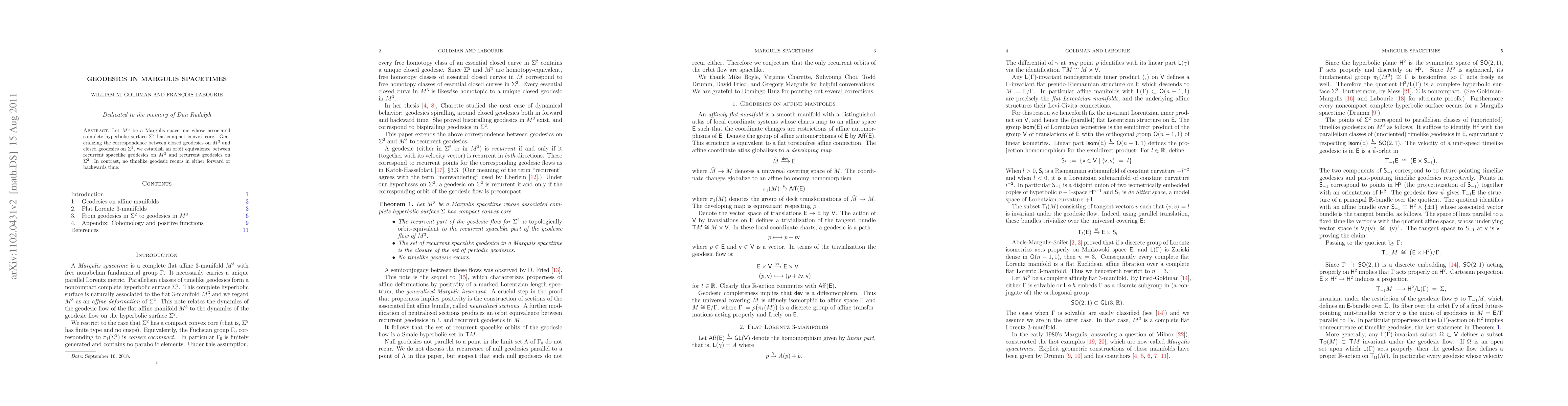Let M be a Margulis spacetime whose associated complete hyperbolic surface S has compact convex core. Generalizing the correspondence between closed geodesics on M and closed geodesics on S, we establish an orbit equivalence between recurrent spacelike geodesics on M and recurrent geodesics on S. In contrast, no timelike geodesic recurs in either forward or backwards time.