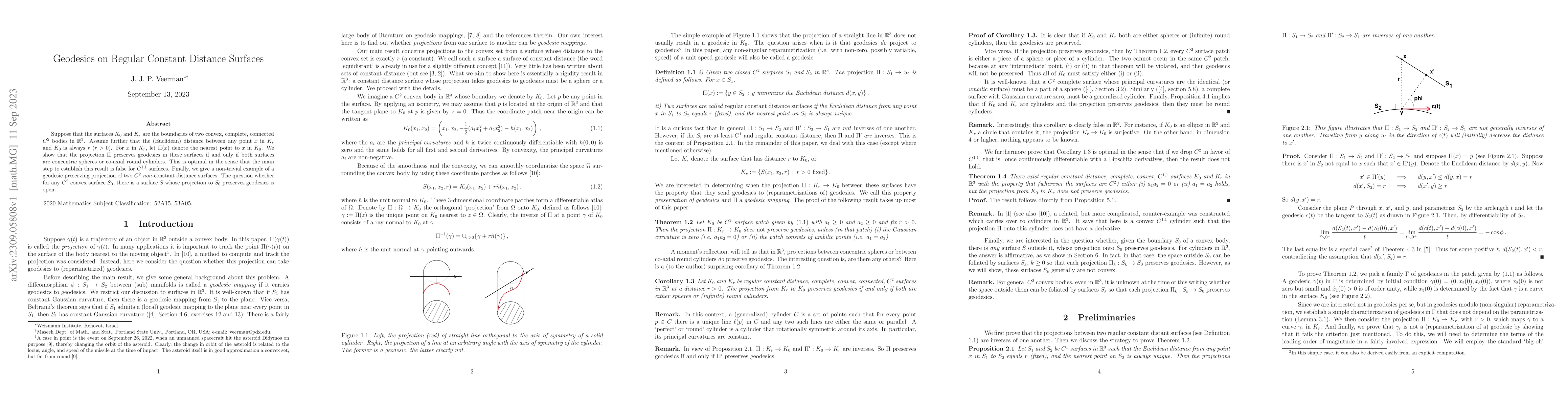 This paper demonstrates that geodesics on regular constant distance surfaces are preserved by projection if and only if the surfaces are concentric spheres or co-axial cylinders. It also presents a non-trivial example of geodesic-preserving projection for C^2 non-constant distance surfaces, while noting the open question of whether such projections exist for general C^2 convex surfaces.