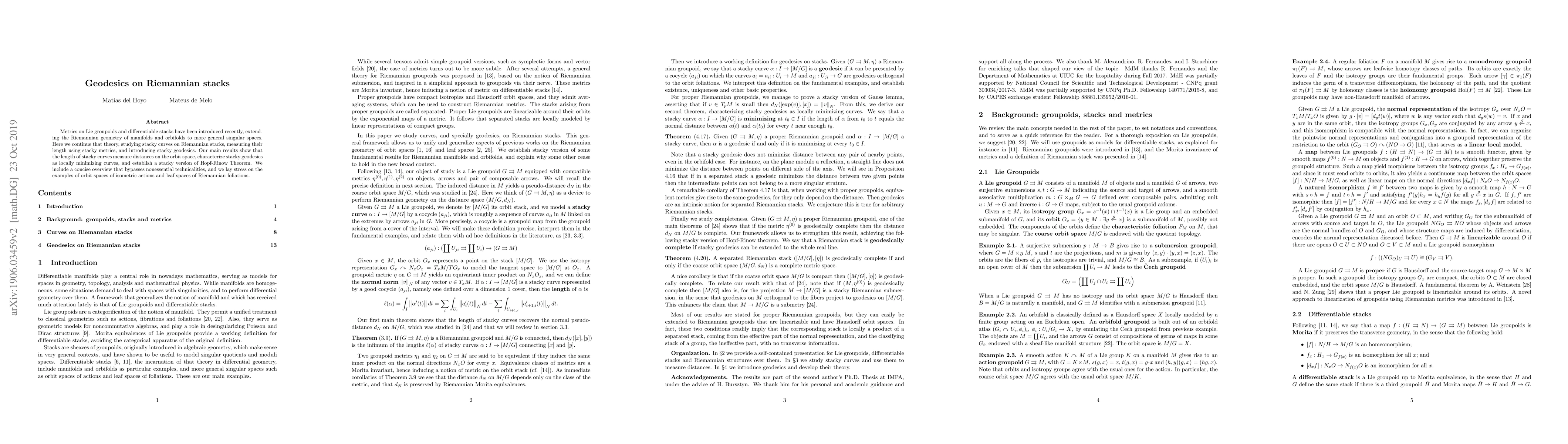 Metrics on Lie groupoids and differentiable stacks have been introduced recently, extending the Riemannian geometry of manifolds and orbifolds to more general singular spaces. Here we continue that theory, studying stacky curves on Riemannian stacks, measuring their length using stacky metrics, and introducing stacky geodesics. Our main results show that the length of stacky curves measure distances on the orbit space, characterize stacky geodesics as locally minimizing curves, and establish a stacky version of Hopf-Rinow Theorem. We include a concise overview that bypasses nonessential technicalities, and we lay stress on the examples of orbit spaces of isometric actions and leaf spaces of Riemannian foliations.