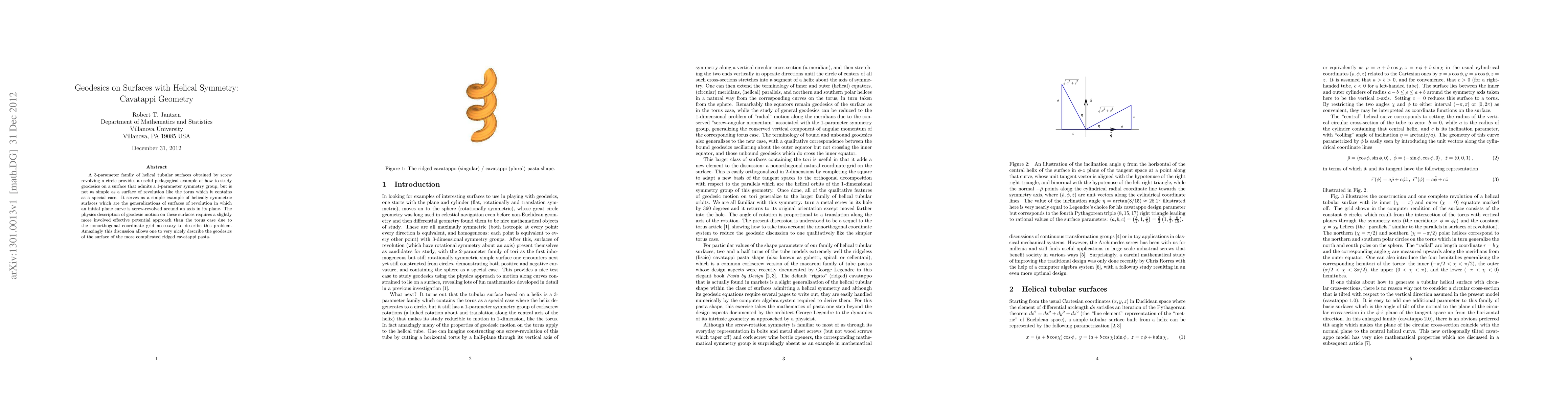 A 3-parameter family of helical tubular surfaces obtained by screw revolving a circle provides a useful pedagogical example of how to study geodesics on a surface that admits a 1-parameter symmetry group, but is not as simple as a surface of revolution like the torus which it contains as a special case. It serves as a simple example of helically symmetric surfaces which are the generalizations of surfaces of revolution in which an initial plane curve is screw-revolved around an axis in its plane. The physics description of geodesic motion on these surfaces requires a slightly more involved effective potential approach than the torus case due to the nonorthogonal coordinate grid necessary to describe this problem. Amazingly this discussion allows one to very nicely describe the geodesics of the surface of the more complicated ridged cavatappi pasta.