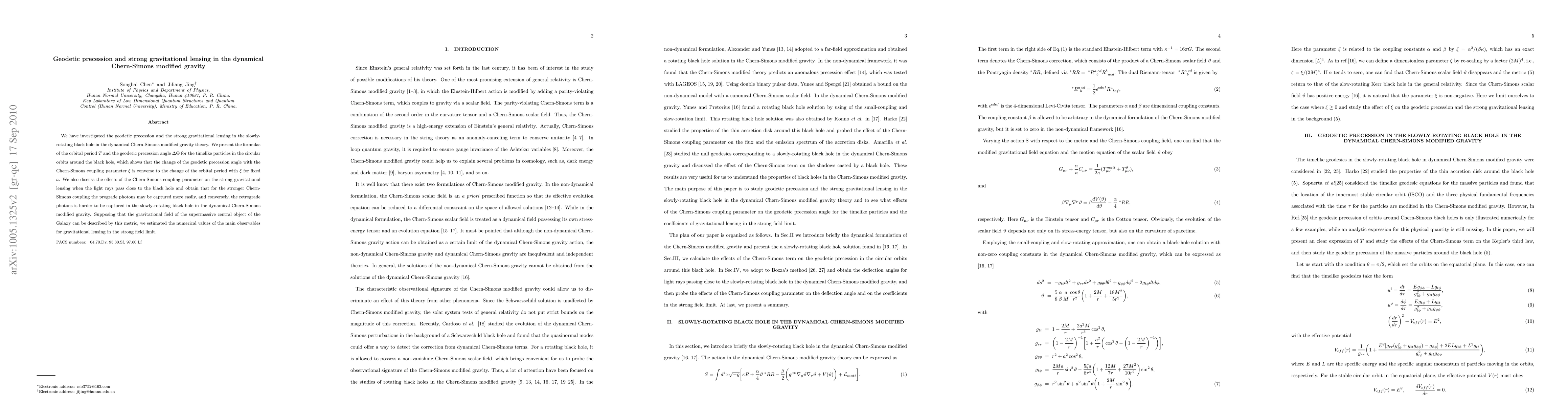 We have investigated the geodetic precession and the strong gravitational lensing in the slowly-rotating black hole in the dynamical Chern-Simons modified gravity theory. We present the formulas of the orbital period $T$ and the geodetic precession angle $\Delta\Theta$ for the timelike particles in the circular orbits around the black hole, which shows that the change of the geodetic precession angle with the Chern-Simons coupling parameter $\xi$ is converse to the change of the orbital period with $\xi$ for fixed $a$. We also discuss the effects of the Chern-Simons coupling parameter on the strong gravitational lensing when the light rays pass close to the black hole and obtain that for the stronger Chern-Simons coupling the prograde photons may be captured more easily, and conversely, the retrograde photons is harder to be captured in the slowly-rotating black hole in the dynamical Chern-Simons modified gravity. Supposing that the gravitational field of the supermassive central object of the Galaxy can be described by this metric, we estimated the numerical values of the main observables for gravitational lensing in the strong field limit.