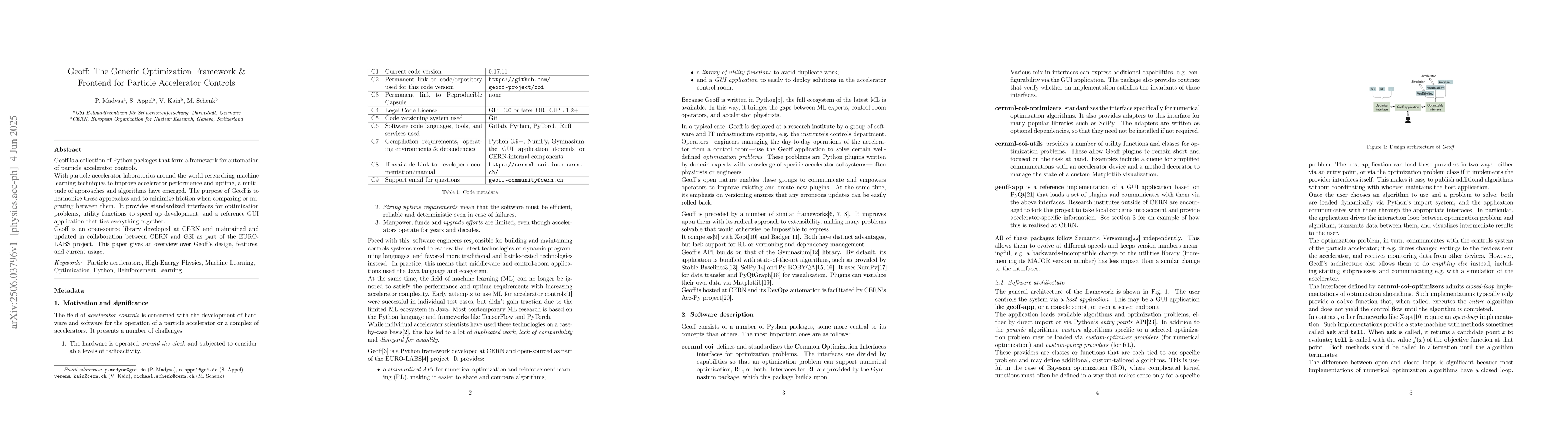 The paper describes the design and features of Geoff, an open-source Python framework for harmonizing machine learning approaches in particle accelerator controls, developed collaboratively by CERN and GSI.