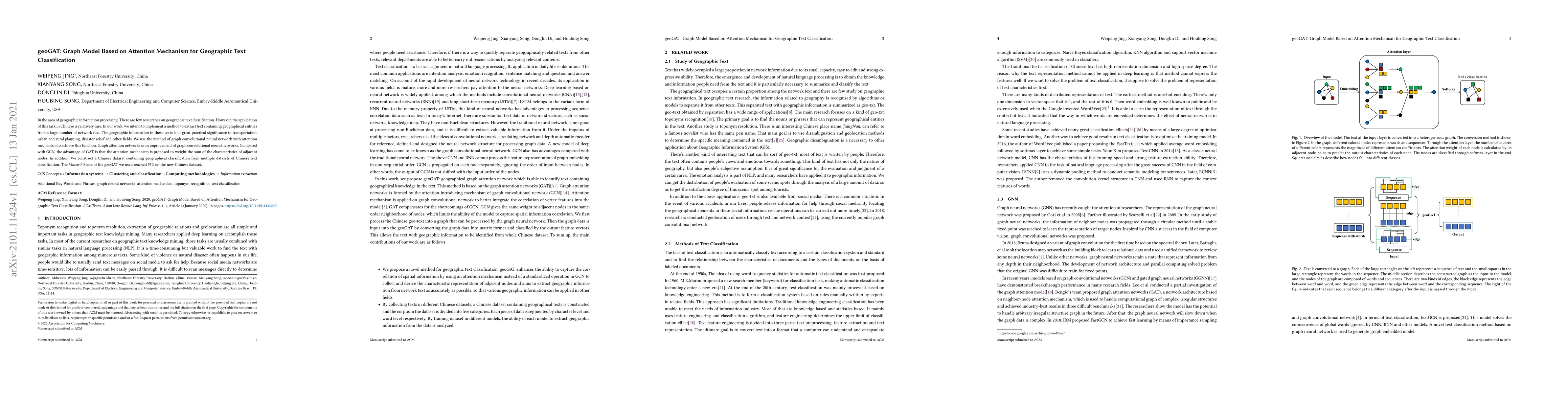 In the area of geographic information processing. There are few researches on geographic text classification. However, the application of this task in Chinese is relatively rare. In our work, we intend to implement a method to extract text containing geographical entities from a large number of network text. The geographic information in these texts is of great practical significance to transportation, urban and rural planning, disaster relief and other fields. We use the method of graph convolutional neural network with attention mechanism to achieve this function. Graph attention networks is an improvement of graph convolutional neural networks. Compared with GCN, the advantage of GAT is that the attention mechanism is proposed to weight the sum of the characteristics of adjacent nodes. In addition, We construct a Chinese dataset containing geographical classification from multiple datasets of Chinese text classification. The Macro-F Score of the geoGAT we used reached 95\% on the new Chinese dataset.
