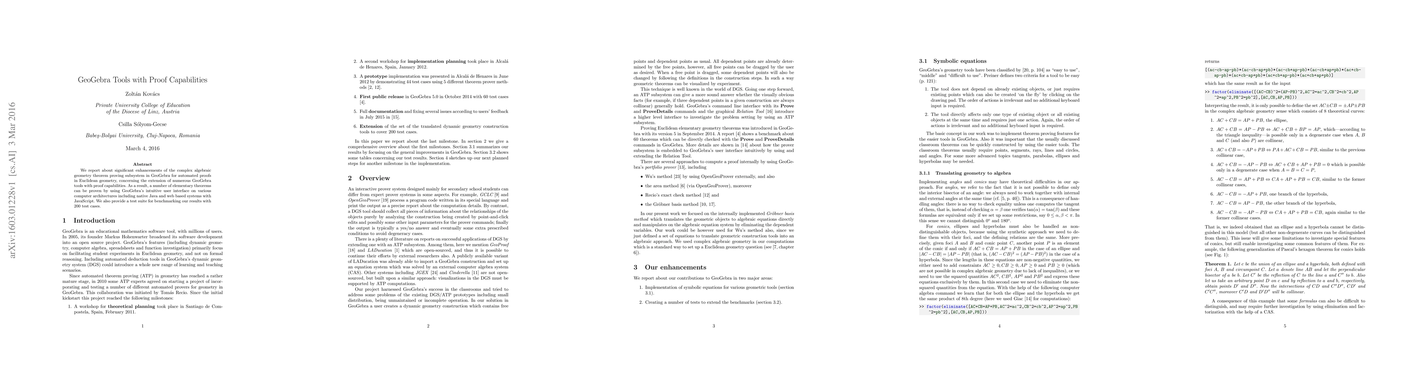 We report about significant enhancements of the complex algebraic geometry theorem proving subsystem in GeoGebra for automated proofs in Euclidean geometry, concerning the extension of numerous GeoGebra tools with proof capabilities. As a result, a number of elementary theorems can be proven by using GeoGebra's intuitive user interface on various computer architectures including native Java and web based systems with JavaScript. We also provide a test suite for benchmarking our results with 200 test cases.