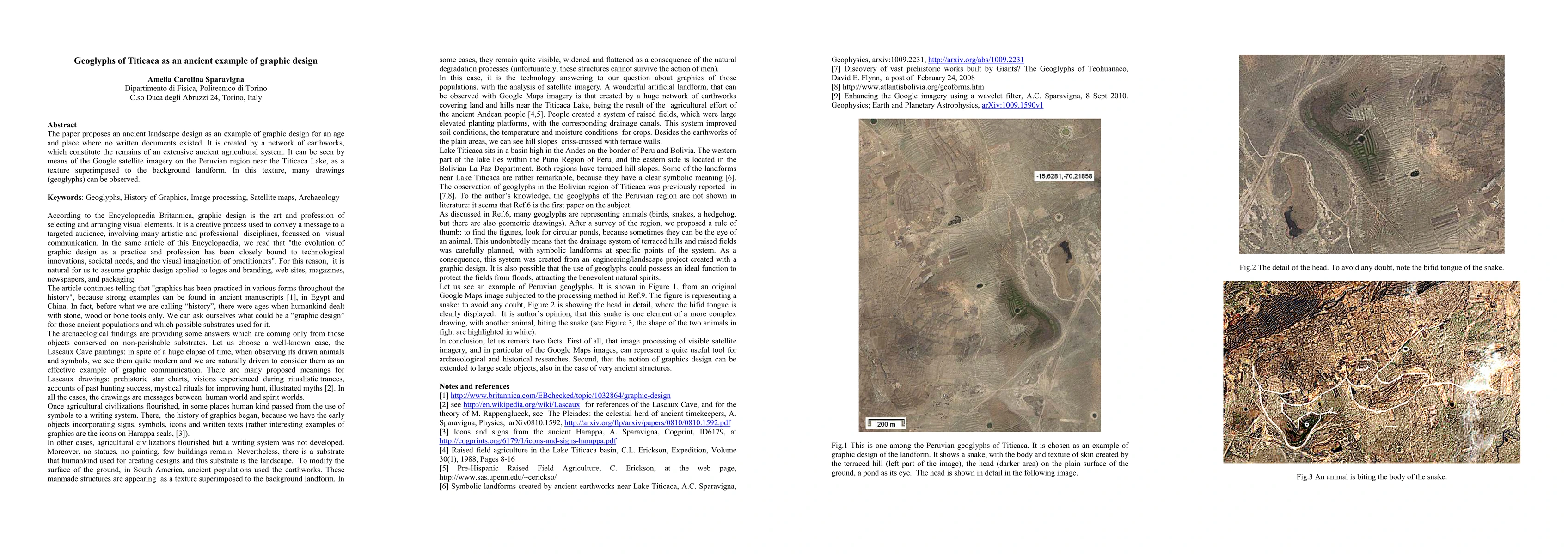 The study highlights ancient earthwork patterns near Lake Titicaca as early examples of graphic design, visible through satellite images. These geoglyphs, part of an ancient agricultural landscape, demonstrate sophisticated landscape planning without written records.