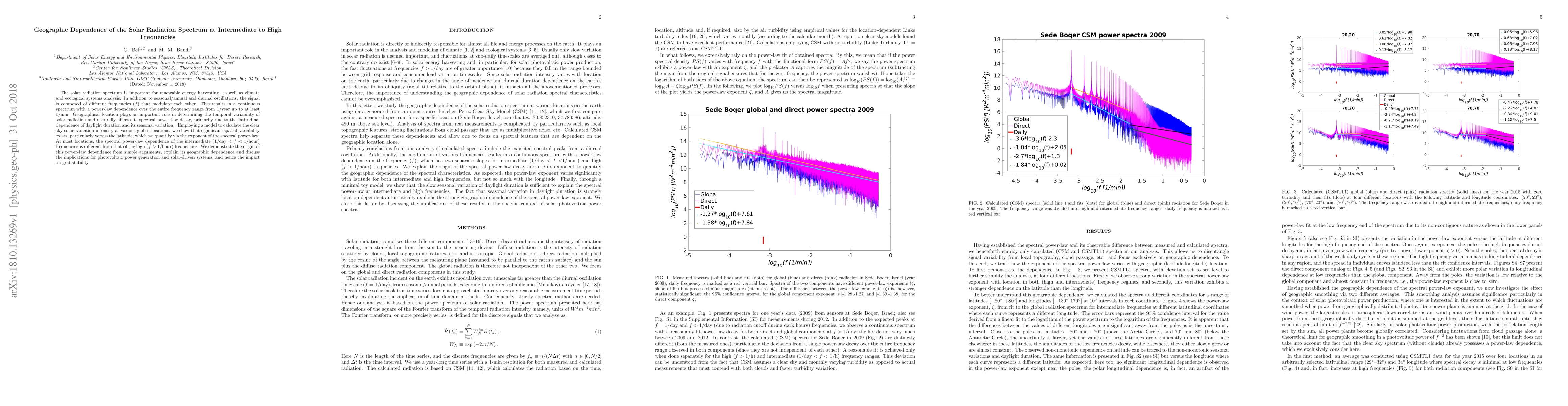This paper investigates the geographic dependence of the solar radiation spectrum at intermediate to high frequencies, revealing significant spatial variability primarily due to latitude. The study shows that the spectral power-law decay differs between intermediate and high frequencies, with implications for photovoltaic power generation and grid stability.