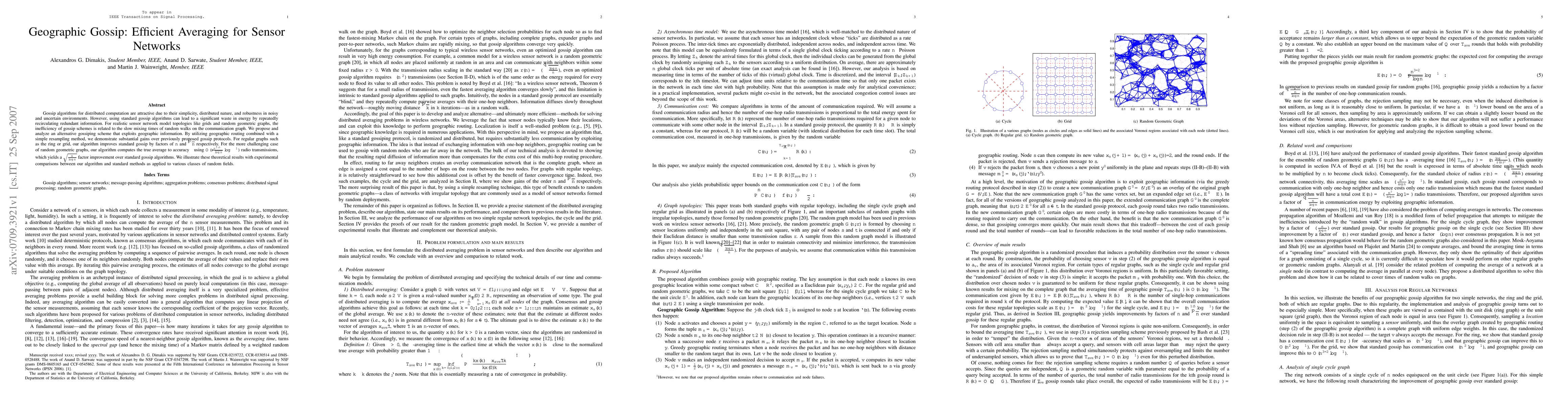 This paper proposes an efficient gossip averaging algorithm for sensor networks that leverages geographic information to reduce redundant information recirculation. The new scheme significantly outperforms standard gossip algorithms, especially in grid and random geometric graph topologies, achieving substantial energy savings and faster convergence.