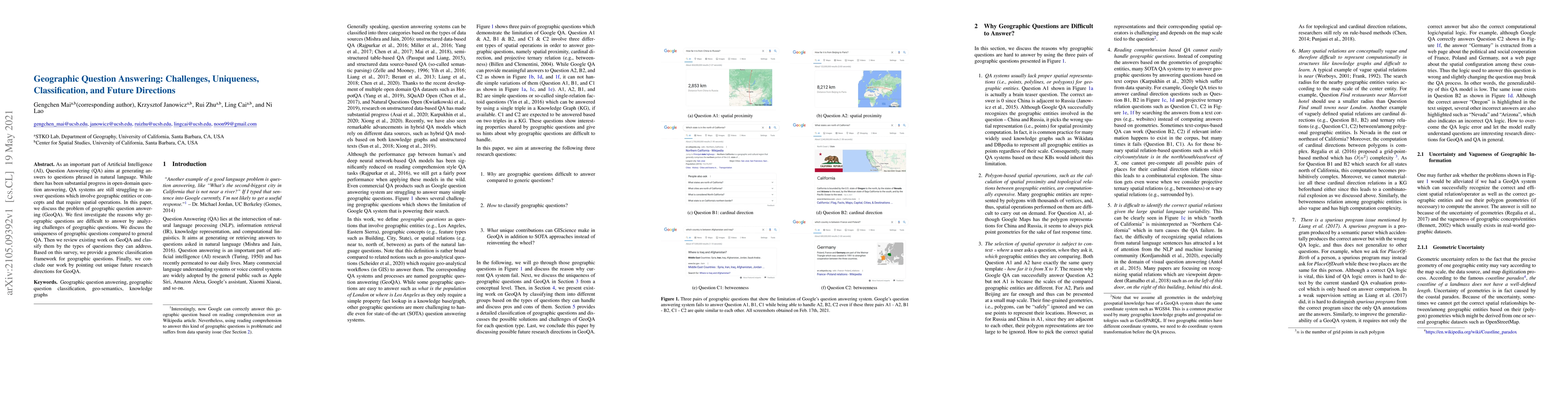 This paper explores the challenges of geographic question answering (GeoQA), identifies the unique difficulties posed by geographic questions, reviews existing GeoQA research, and proposes a classification framework for such questions, ultimately suggesting future research directions to improve GeoQA systems.