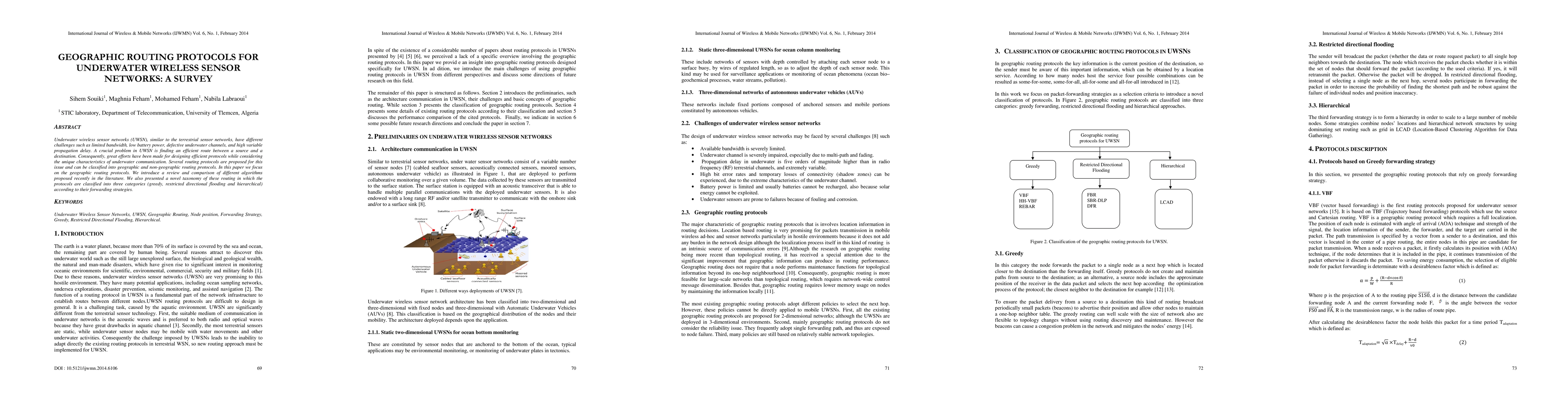 This paper surveys geographic routing protocols for underwater wireless sensor networks (UWSN), highlighting their unique challenges and categorizing recent algorithms into greedy, restricted directional flooding, and hierarchical strategies. The study compares these protocols to identify efficient routing solutions for underwater communication.