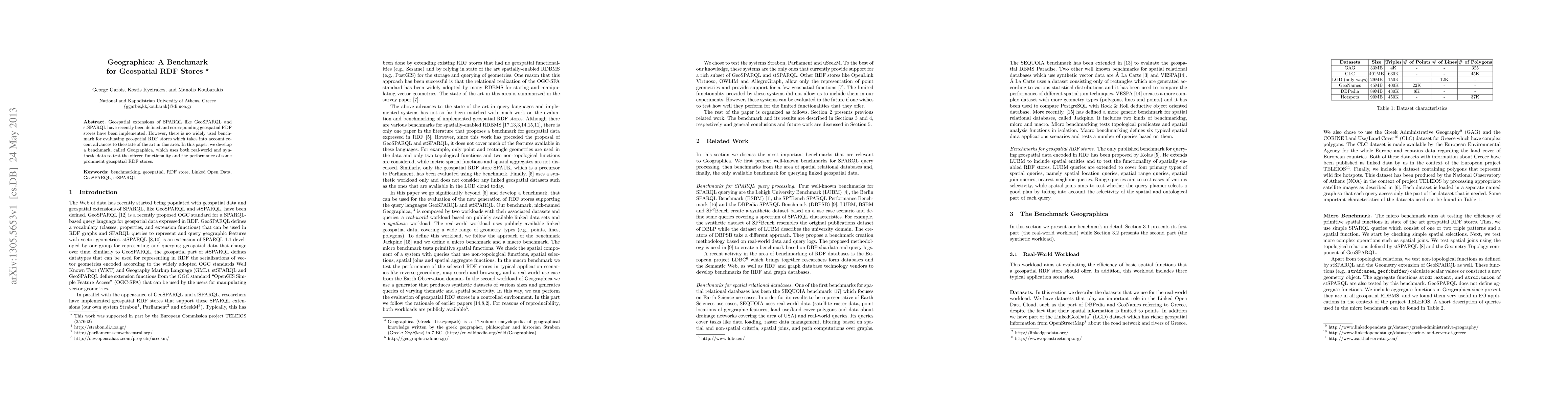 The paper develops Geographica, a benchmark for evaluating geospatial RDF stores using both real-world and synthetic data, covering recent advances in GeoSPARQL and stSPARQL.