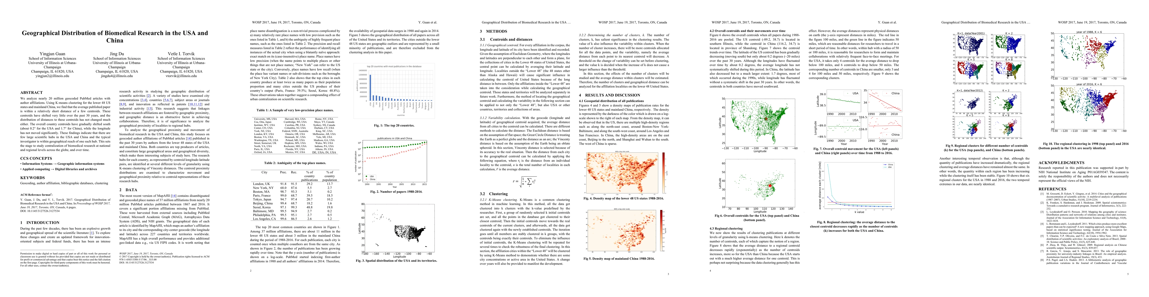 We analyze nearly 20 million geocoded PubMed articles with author affiliations. Using K-means clustering for the lower 48 US states and mainland China, we find that the average published paper is within a relatively short distance of a few centroids. These centroids have shifted very little over the past 30 years, and the distribution of distances to these centroids has not changed much either. The overall country centroids have gradually shifted south (about 0.2{\deg} for the USA and 1.7{\deg} for China), while the longitude has not moved significantly. These findings indicate that there are few large scientific hubs in the USA and China and the typical investigator is within geographical reach of one such hub. This sets the stage to study centralization of biomedical research at national and regional levels across the globe, and over time.