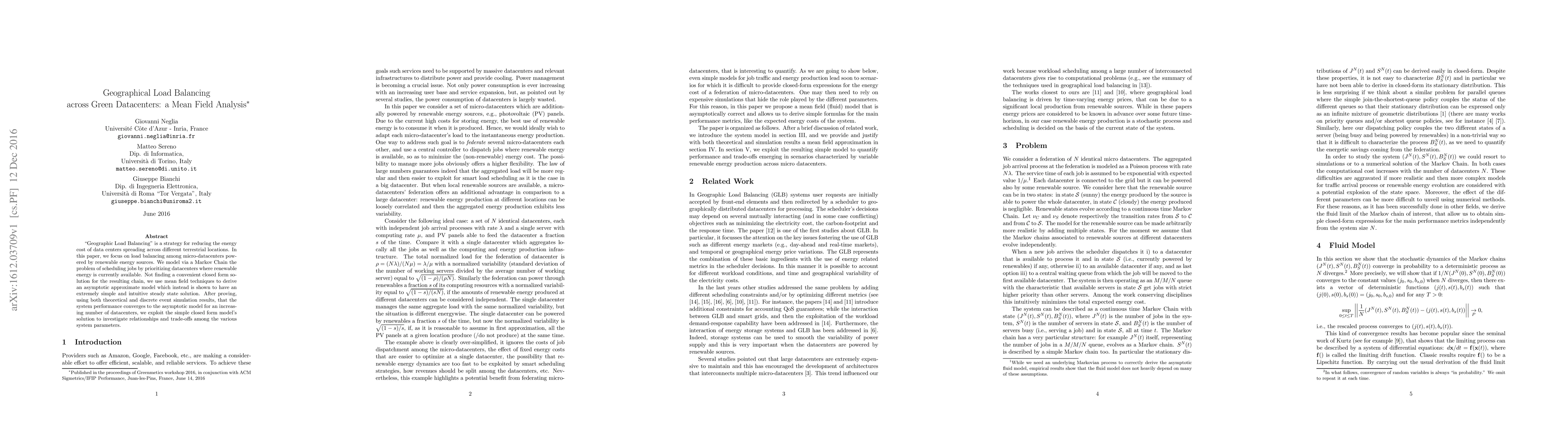 "Geographic Load Balancing" is a strategy for reducing the energy cost of data centers spreading across different terrestrial locations. In this paper, we focus on load balancing among micro-datacenters powered by renewable energy sources. We model via a Markov Chain the problem of scheduling jobs by prioritizing datacenters where renewable energy is currently available. Not finding a convenient closed form solution for the resulting chain, we use mean field techniques to derive an asymptotic approximate model which instead is shown to have an extremely simple and intuitive steady state solution. After proving, using both theoretical and discrete event simulation results, that the system performance converges to the asymptotic model for an increasing number of datacenters, we exploit the simple closed form model's solution to investigate relationships and trade-offs among the various system parameters.
