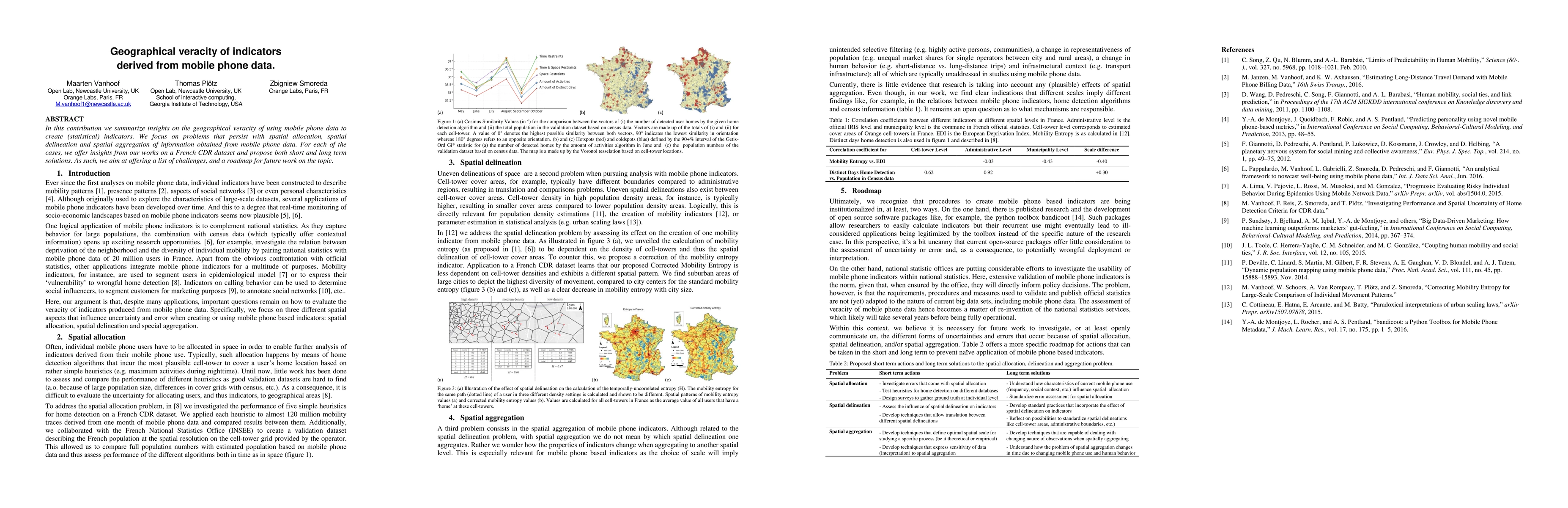 In this contribution we summarize insights on the geographical veracity of using mobile phone data to create (statistical) indicators. We focus on problems that persist with spatial allocation, spatial delineation and spatial aggregation of information obtained from mobile phone data. For each of the cases, we offer insights from our works on a French CDR dataset and propose both short and long term solutions. As such, we aim at offering a list of challenges, and a roadmap for future work on the topic.