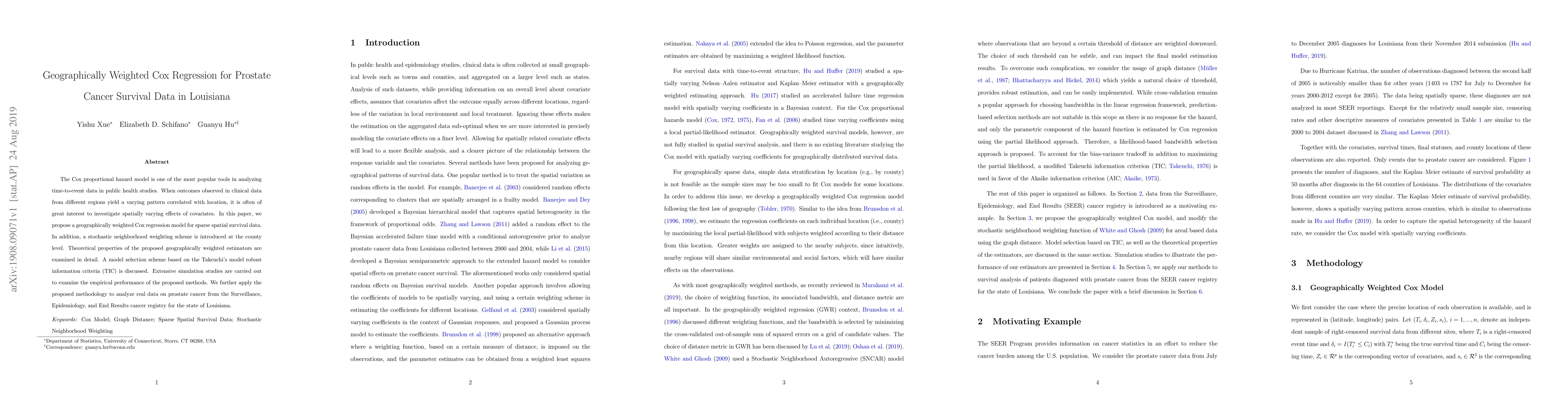 The paper proposes a geographically weighted Cox regression model for sparse spatial survival data, introducing a stochastic neighborhood weighting scheme at the county level in Louisiana. Theoretical properties of the proposed geographically weighted estimators are examined, and a model selection scheme based on Takeuchi's model robust information criteria (TIC) is discussed.