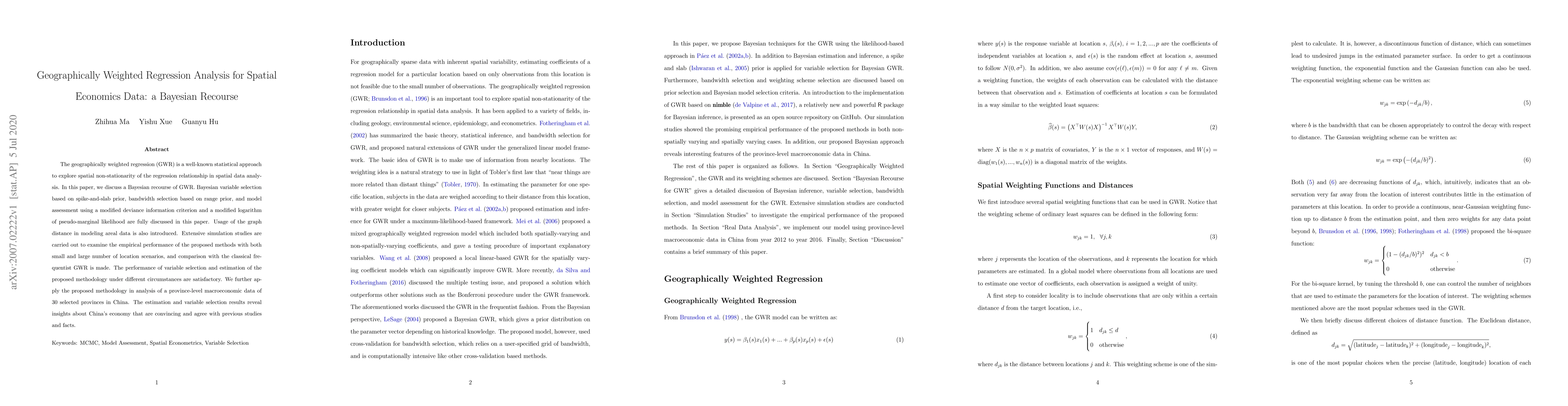 This paper proposes a Bayesian approach to geographically weighted regression (GWR) for spatial economics data, incorporating Bayesian variable selection, bandwidth selection, and model assessment techniques. The methodology is validated through extensive simulations and applied to macroeconomic data from 30 Chinese provinces, yielding insights that align with existing economic knowledge.