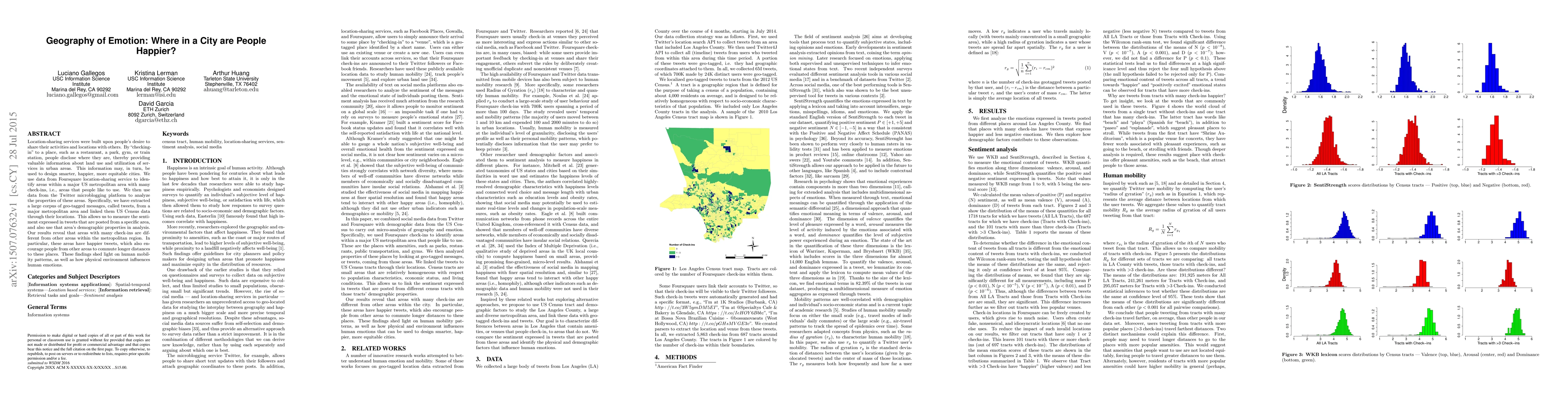 Location-sharing services were built upon people's desire to share their activities and locations with others. By "checking-in" to a place, such as a restaurant, a park, gym, or train station, people disclose where they are, thereby providing valuable information about land use and utilization of services in urban areas. This information may, in turn, be used to design smarter, happier, more equitable cities. We use data from Foursquare location-sharing service to identify areas within a major US metropolitan area with many check-ins, i.e., areas that people like to use. We then use data from the Twitter microblogging platform to analyze the properties of these areas. Specifically, we have extracted a large corpus of geo-tagged messages, called tweets, from a major metropolitan area and linked them US Census data through their locations. This allows us to measure the sentiment expressed in tweets that are posted from a specific area, and also use that area's demographic properties in analysis. Our results reveal that areas with many check-ins are different from other areas within the metropolitan region. In particular, these areas have happier tweets, which also encourage people from other areas to commute longer distances to these places. These findings shed light on human mobility patterns, as well as how physical environment influences human emotions.