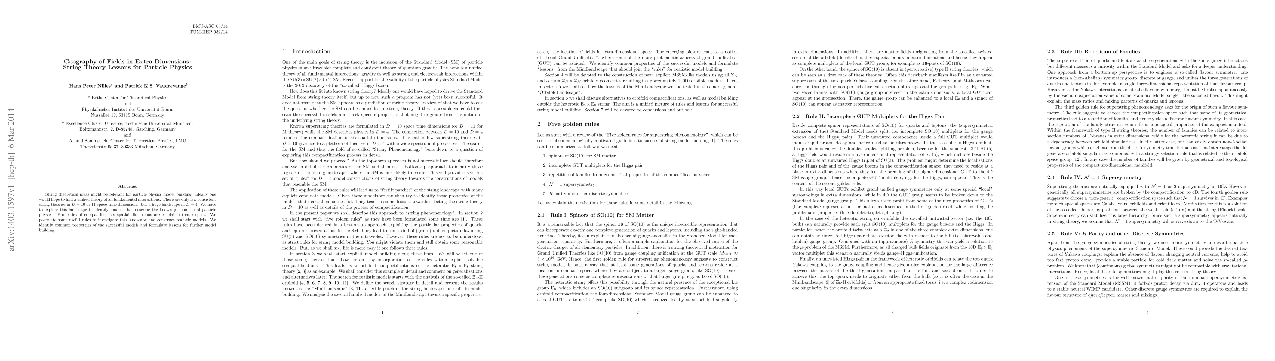 This paper explores how string theory in extra dimensions can inform particle physics model building, focusing on the landscape of possible models in D=4 dimensions. It proposes useful rules for constructing realistic models based on the properties of compactified six spatial dimensions, identifying common features of successful models and providing lessons for future research.