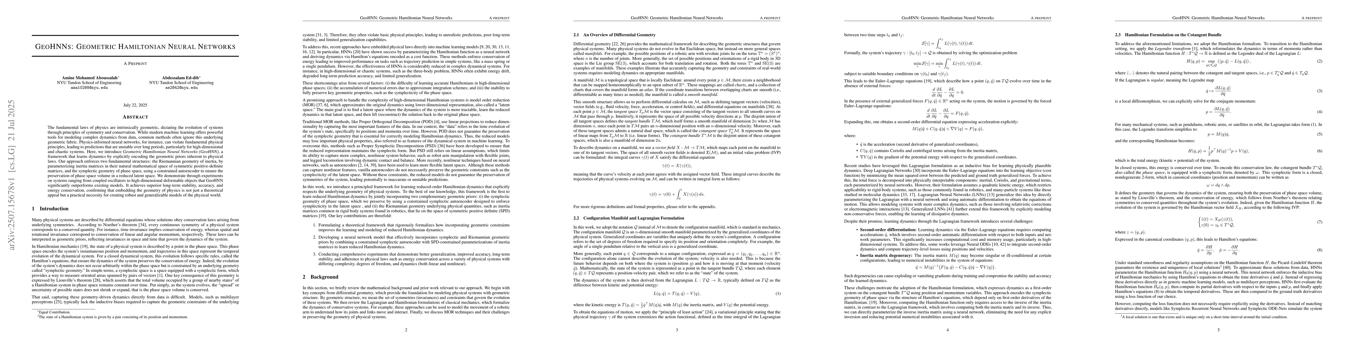 The fundamental laws of physics are intrinsically geometric, dictating the evolution of systems through principles of symmetry and conservation. While modern machine learning offers powerful tools for modeling complex dynamics from data, common methods often ignore this underlying geometric fabric. Physics-informed neural networks, for instance, can violate fundamental physical principles, leading to predictions that are unstable over long periods, particularly for high-dimensional and chaotic systems. Here, we introduce \textit{Geometric Hamiltonian Neural Networks (GeoHNN)}, a framework that learns dynamics by explicitly encoding the geometric priors inherent to physical laws. Our approach enforces two fundamental structures: the Riemannian geometry of inertia, by parameterizing inertia matrices in their natural mathematical space of symmetric positive-definite matrices, and the symplectic geometry of phase space, using a constrained autoencoder to ensure the preservation of phase space volume in a reduced latent space. We demonstrate through experiments on systems ranging from coupled oscillators to high-dimensional deformable objects that GeoHNN significantly outperforms existing models. It achieves superior long-term stability, accuracy, and energy conservation, confirming that embedding the geometry of physics is not just a theoretical appeal but a practical necessity for creating robust and generalizable models of the physical world.