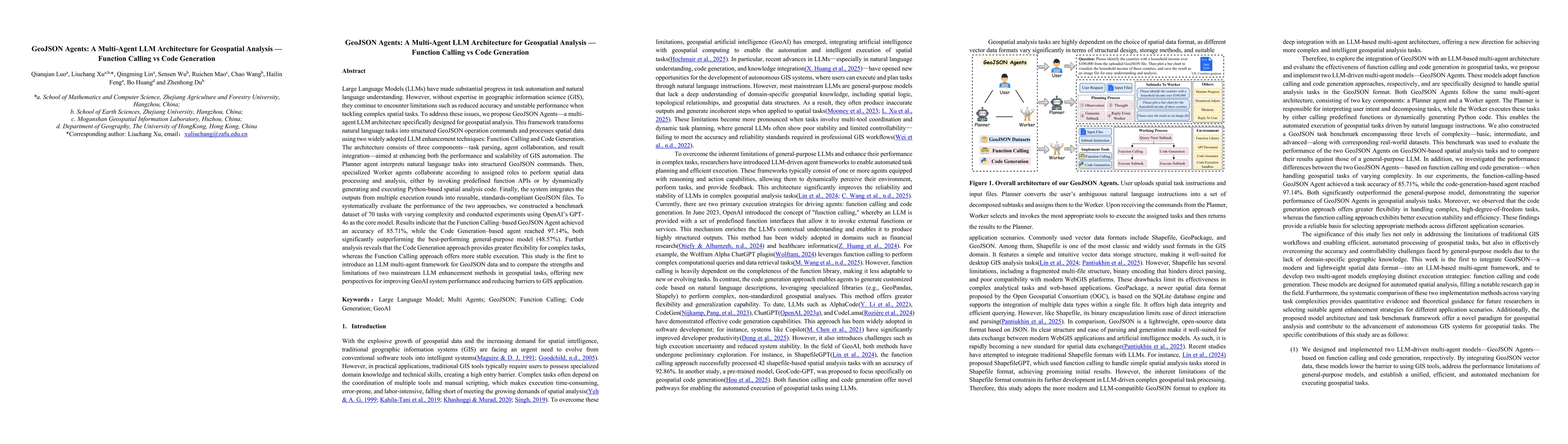LLMs have made substantial progress in task automation and natural language understanding.However,without expertise in GIS,they continue to encounter limitations.To address these issues, we propose GeoJSON Agents-a multi-agent LLM architecture.This framework transforms natural language tasks into structured GeoJSON operation commands and processes spatial data using two widely adopted LLM enhancement techniques:Function Calling and Code Generation.The architecture consists of three components-task parsing,agent collaboration,and result integration-aimed at enhancing both the performance and scalability of GIS automation.The Planner agent interprets natural language tasks into structured GeoJSON commands.Then,specialized Worker agents collaborate according to assigned roles to perform spatial data processing and analysis,either by invoking predefined function APIs or by dynamically generating and executing Python-based spatial analysis code.Finally,the system integrates the outputs from multiple execution rounds into reusable,standards-compliant GeoJSON files.To systematically evaluate the performance of the two approaches,we constructed a benchmark dataset of 70 tasks with varying complexity and conducted experiments using OpenAI's GPT-4o as the core model.Results indicate that the Function Calling-based GeoJSON Agent achieved an accuracy of 85.71%,while the Code Generation-based agent reached 97.14%,both significantly outperforming the best-performing general-purpose model (48.57%).Further analysis reveals that the Code Generation provides greater flexibility,whereas the Function Calling approach offers more stable execution.This study is the first to introduce an LLM multi-agent framework for GeoJSON data and to compare the strengths and limitations of two mainstream LLM enhancement methods,offering new perspectives for improving GeoAI system performance.