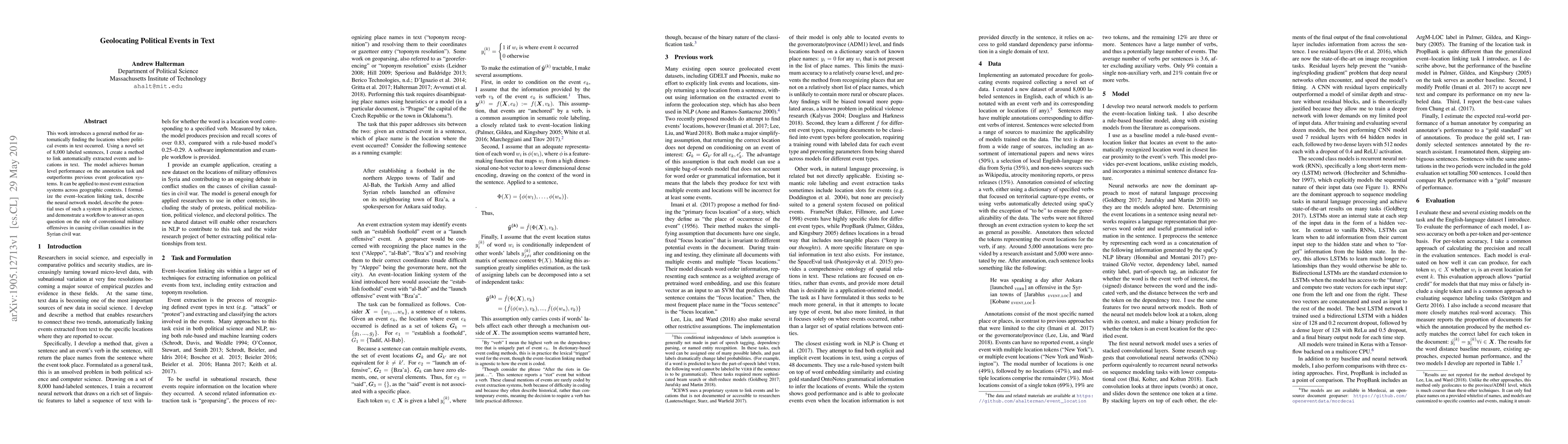 This work introduces a general method for automatically finding the locations where political events in text occurred. Using a novel set of 8,000 labeled sentences, I create a method to link automatically extracted events and locations in text. The model achieves human level performance on the annotation task and outperforms previous event geolocation systems. It can be applied to most event extraction systems across geographic contexts. I formalize the event--location linking task, describe the neural network model, describe the potential uses of such a system in political science, and demonstrate a workflow to answer an open question on the role of conventional military offensives in causing civilian casualties in the Syrian civil war.