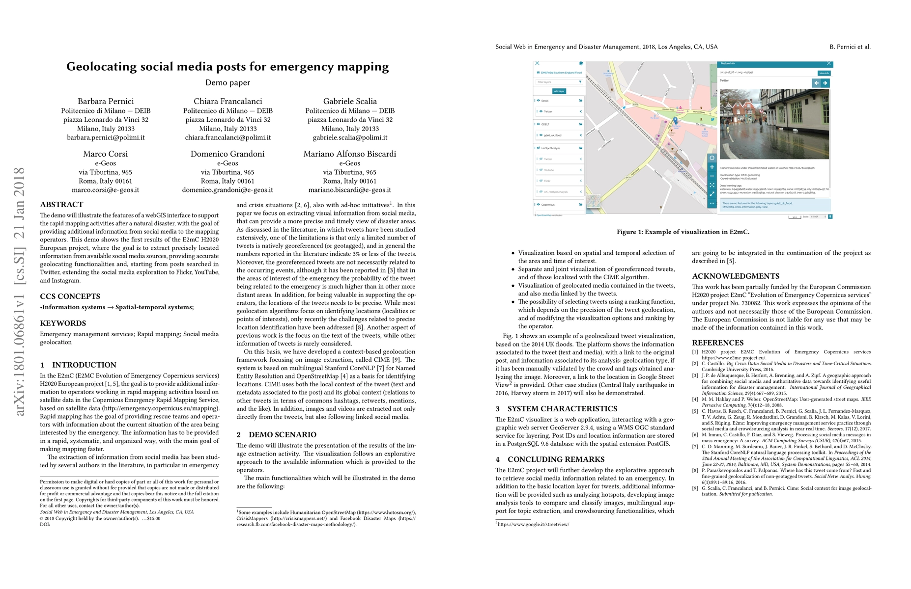 This research demonstrates a webGIS interface for rapid emergency mapping post-disaster, integrating geolocated information from social media platforms like Twitter, Flickr, YouTube, and Instagram to enhance mapping accuracy. The project aims to extract precise geolocation data from social media to support mapping operators.