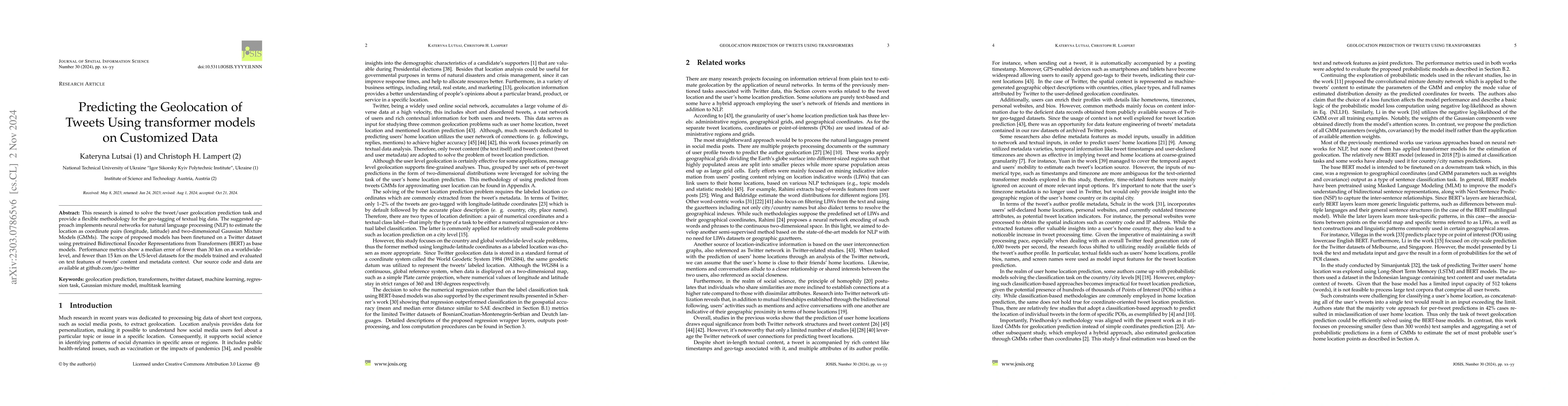 This research is aimed to solve the tweet/user geolocation prediction task and provide a flexible methodology for the geotagging of textual big data. The suggested approach implements neural networks for natural language processing (NLP) to estimate the location as coordinate pairs (longitude, latitude) and two-dimensional Gaussian Mixture Models (GMMs). The scope of proposed models has been finetuned on a Twitter dataset using pretrained Bidirectional Encoder Representations from Transformers (BERT) as base models. Performance metrics show a median error of fewer than 30 km on a worldwide-level, and fewer than 15 km on the US-level datasets for the models trained and evaluated on text features of tweets' content and metadata context. Our source code and data are available at https://github.com/K4TEL/geo-twitter.git