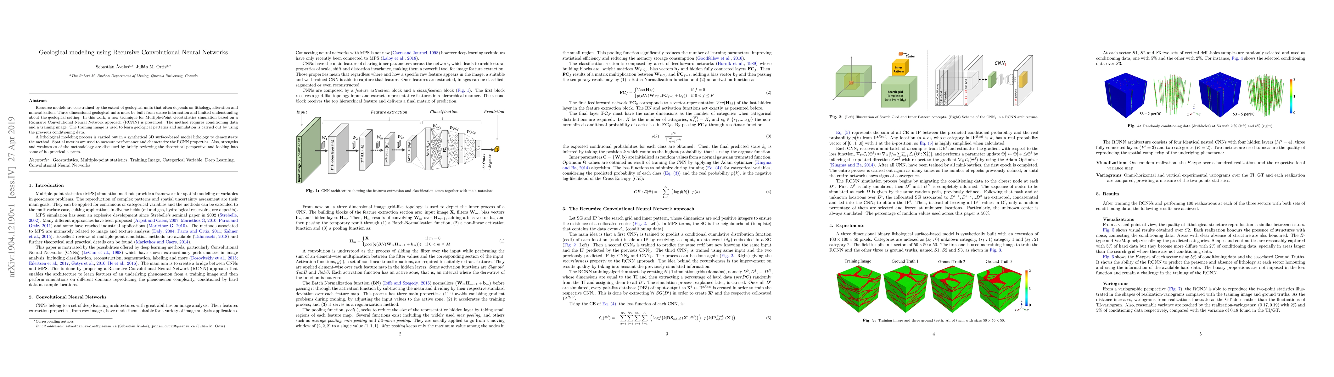 This paper introduces a recursive convolutional neural network (RCNN) approach for constructing three-dimensional geological models from limited data, using a training image to learn geological patterns. The method is demonstrated on a copper deposit in Chile, showing its effectiveness compared to traditional techniques.