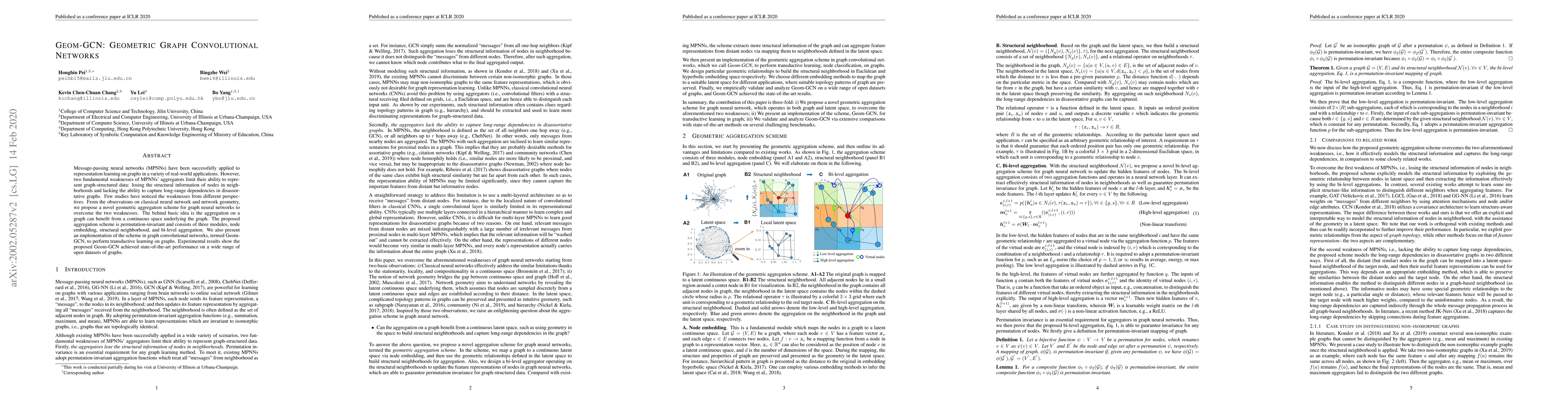 The paper proposes Geom-GCN, a novel geometric aggregation scheme for graph neural networks that addresses the structural information loss and long-range dependency issues in message-passing neural networks. The scheme, implemented in Geom-GCN, achieves state-of-the-art performance on various graph datasets.
