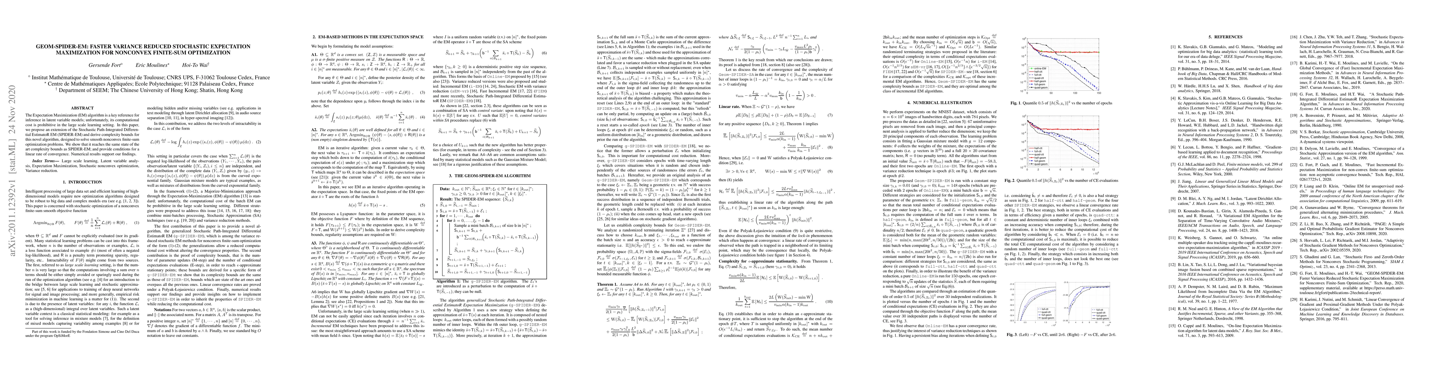 This paper proposes Geom-SPIDER-EM, an extension of the Stochastic Path-Integrated Differential EstimatoR EM (SPIDER-EM) algorithm, to efficiently solve large scale, smooth nonconvex finite-sum optimization problems. It achieves state-of-the-art complexity bounds and demonstrates linear convergence rates, supported by numerical results.