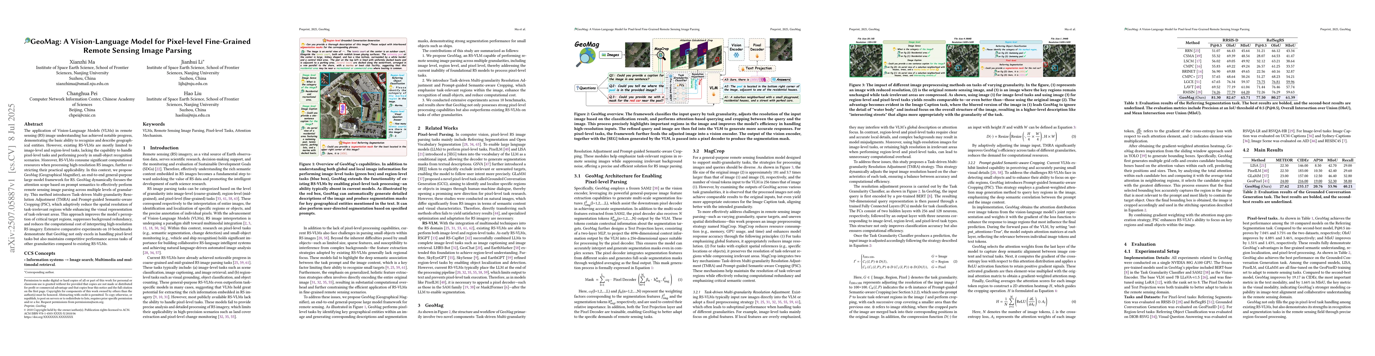 The application of Vision-Language Models (VLMs) in remote sensing (RS) image understanding has achieved notable progress, demonstrating the basic ability to recognize and describe geographical entities. However, existing RS-VLMs are mostly limited to image-level and region-level tasks, lacking the capability to handle pixel-level tasks and performing poorly in small-object recognition scenarios. Moreover, RS-VLMs consume significant computational resources when processing high-resolution RS images, further restricting their practical applicability. In this context, we propose GeoMag (Geographical Magnifier), an end-to-end general-purpose large model framework for RS. GeoMag dynamically focuses the attention scope based on prompt semantics to effectively perform remote sensing image parsing across multiple levels of granularity. This method introduces Task-driven Multi-granularity Resolution Adjustment (TMRA) and Prompt-guided Semantic-aware Cropping (PSC), which adaptively reduce the spatial resolution of task-irrelevant regions while enhancing the visual representation of task-relevant areas. This approach improves the model's perception of critical target regions, suppresses background redundancy, and reduces the computational cost of interpreting high-resolution RS imagery. Extensive comparative experiments on 10 benchmarks demonstrate that GeoMag not only excels in handling pixel-level tasks but also maintains competitive performance across tasks of other granularities compared to existing RS-VLMs.