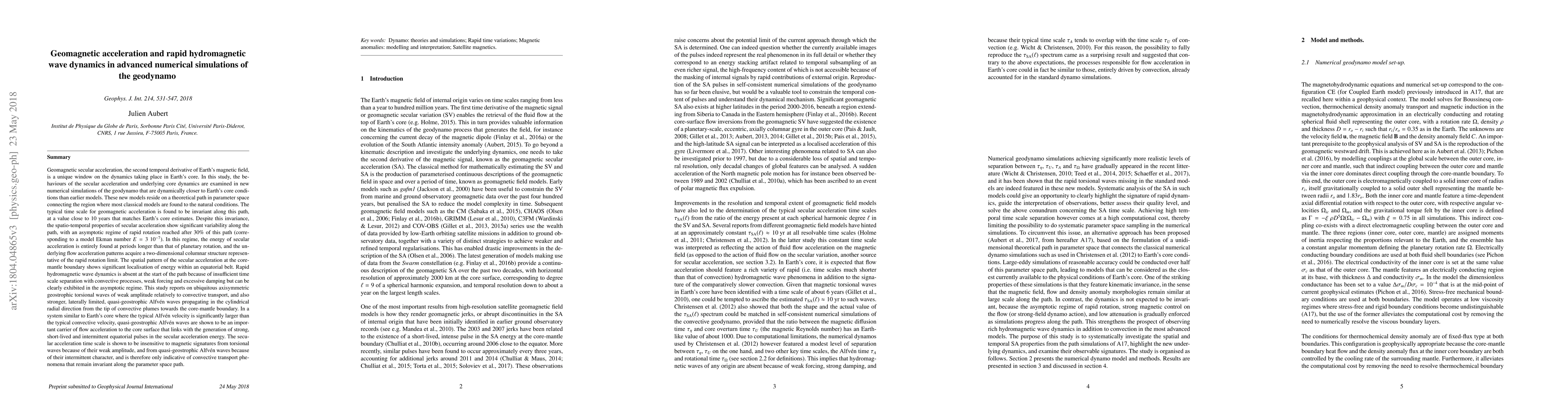 Geomagnetic secular acceleration is a unique window on the dynamics taking place in Earth's core. In this study, the behaviours of the secular acceleration and underlying core dynamics are examined in new numerical simulations of the geodynamo that reside on a theoretical path in parameter space connecting the region where most classical models are found to the natural conditions. The typical time scale for geomagnetic acceleration is found to be invariant along this path, at a value close to 10 years that matches Earth's core estimates. Despite this invariance, the spatio-temporal properties of secular acceleration show significant variability along the path, with an asymptotic regime of rapid rotation reached after 30% of this path (corresponding to a model Ekman number $E=3~10^{-7}$). In this regime, the energy of secular acceleration is entirely found at periods longer than that of planetary rotation, and the underlying flow acceleration patterns acquire a two-dimensional columnar structure representative of the rapid rotation limit. The spatial pattern of the secular acceleration at the core-mantle boundary shows significant localisation of energy within an equatorial belt. Rapid hydromagnetic wave dynamics is absent at the start of the path but can be clearly exhibited in the asymptotic regime. This study reports on ubiquitous axisymmetric geostrophic torsional waves of weak amplitude relatively to convective transport, and also stronger, laterally limited, quasi-geostrophic Alfv\'en waves propagating in the cylindrical radial direction from the tip of convective plumes towards the core-mantle boundary. Quasi-geostrophic Alfv\'en waves are shown to be an important carrier of flow acceleration to the core surface that links with the generation of strong, short-lived and intermittent equatorial pulses in the secular acceleration energy.