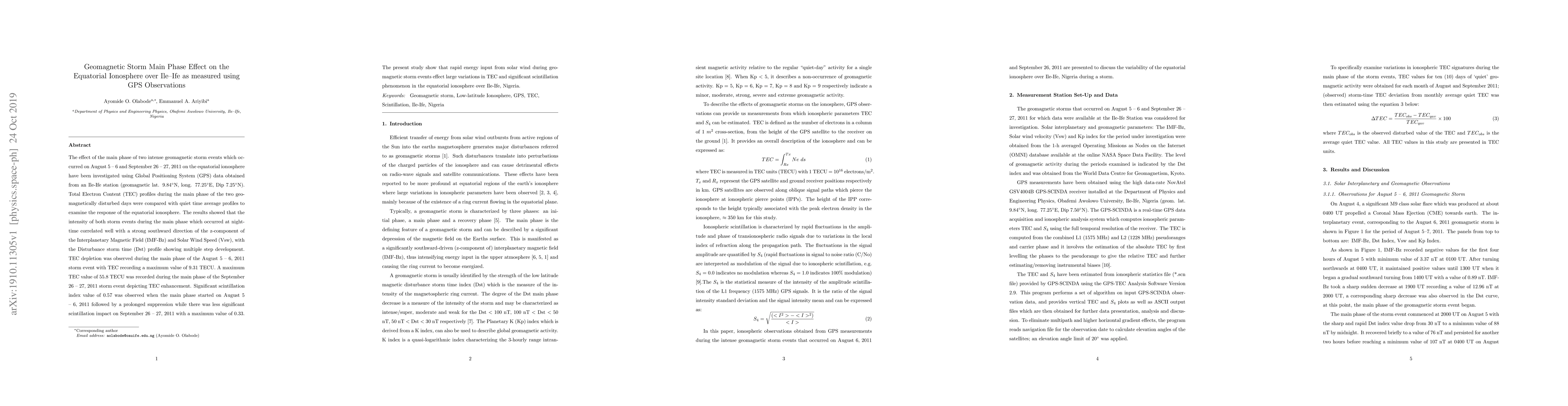 This study investigates the impact of two intense geomagnetic storms in August and September 2011 on the equatorial ionosphere over Ile-Ife using GPS data. Results show TEC depletion and enhancement during the main phases, correlating with strong southward IMF-Bz and high solar wind speeds, and significant scintillation effects.