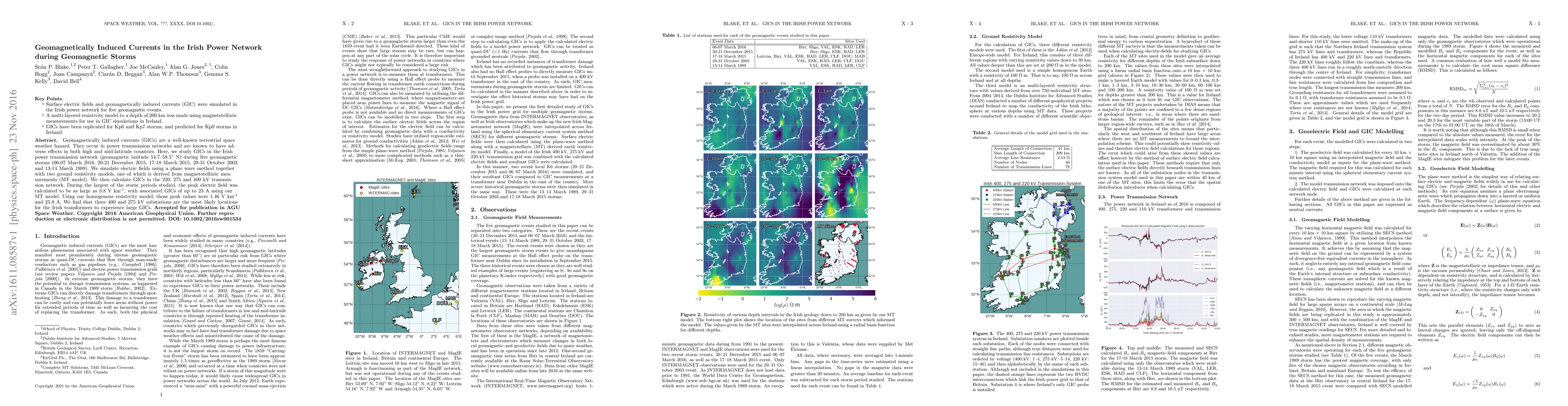 This study investigates geomagnetically induced currents (GICs) in the Irish power network during five geomagnetic storms, employing a plane wave method and resistivity models derived from magnetotelluric measurements. The largest storm resulted in peak electric fields of 3.8 V km⁻¹, with associated GICs up to 23 A, highlighting the vulnerability of three substations in the 400 and 275 kV transmission network.