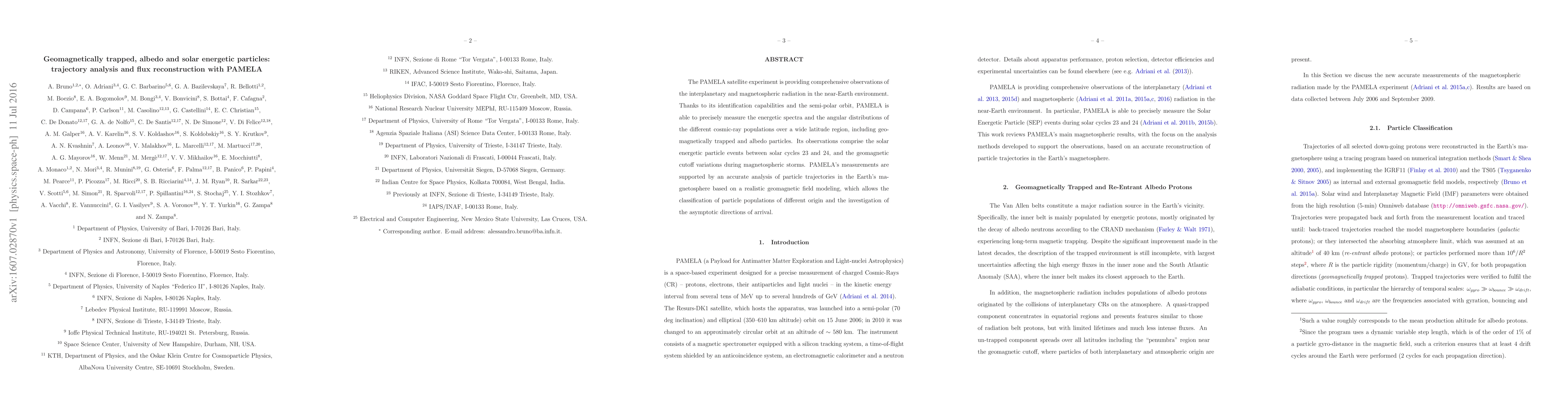 The PAMELA satellite experiment measures cosmic rays, including geomagnetically trapped and albedo particles, using trajectory analysis and flux reconstruction. It provides detailed observations of solar energetic particles and geomagnetic cutoff variations during storms.