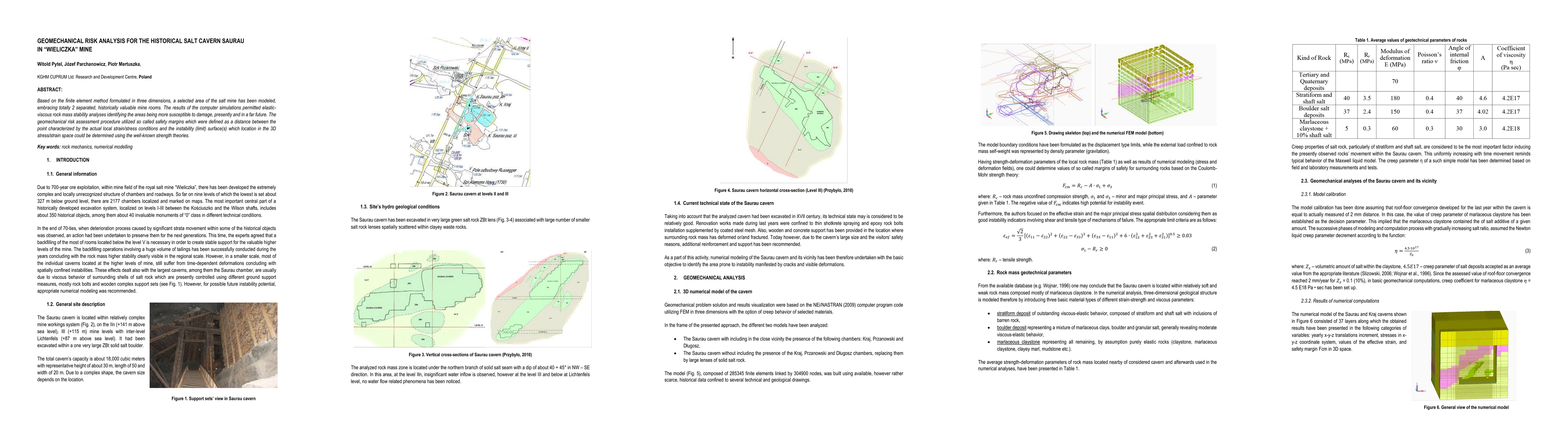 Based on the finite element method formulated in three dimensions, a selected area of the salt mine has been modeled, embracing totally 2 separated, historically valuable mine rooms. The results of the computer simulations permitted elastic-viscous rock mass stability analyses identifying the areas being more susceptible to damage, presently and in a far future. The geomechanical risk assessment procedure utilized so called safety margins which were defined as a distance between the point characterized by the actual local strain/stress conditions and the instability (limit) surface(s) which location in the 3D stress/strain space could be determined using the well-known strength theories,