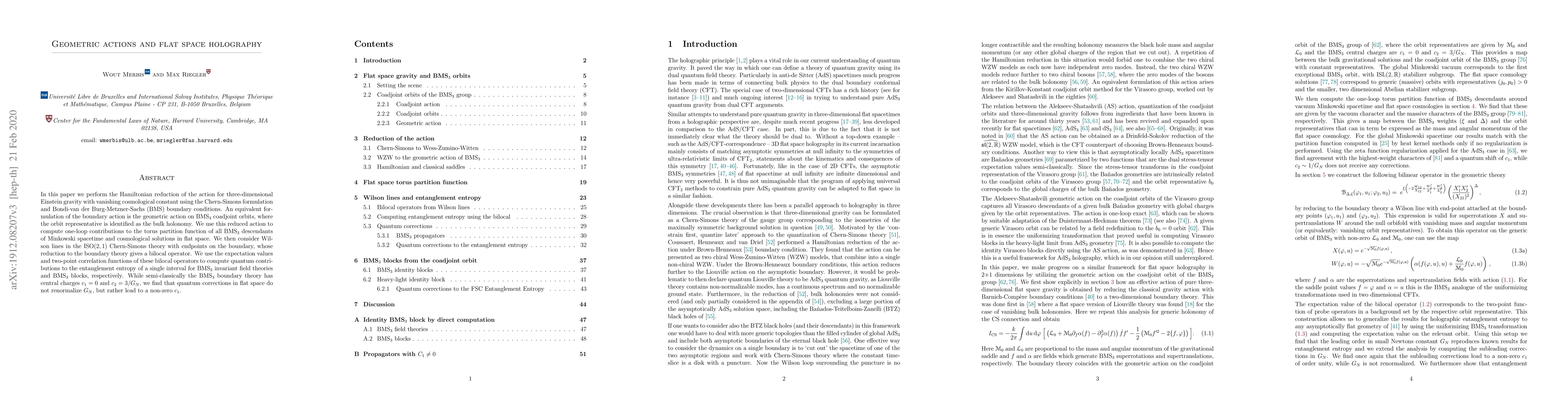 In this paper we perform the Hamiltonian reduction of the action for three-dimensional Einstein gravity with vanishing cosmological constant using the Chern-Simons formulation and Bondi-van der Burg-Metzner-Sachs (BMS) boundary conditions. An equivalent formulation of the boundary action is the geometric action on BMS$_3$ coadjoint orbits, where the orbit representative is identified as the bulk holonomy. We use this reduced action to compute one-loop contributions to the torus partition function of all BMS$_3$ descendants of Minkowski spacetime and cosmological solutions in flat space. We then consider Wilson lines in the ISO$(2,1)$ Chern-Simons theory with endpoints on the boundary, whose reduction to the boundary theory gives a bilocal operator. We use the expectation values and two-point correlation functions of these bilocal operators to compute quantum contributions to the entanglement entropy of a single interval for BMS$_3$ invariant field theories and BMS$_3$ blocks, respectively. While semi-classically the BMS$_3$ boundary theory has central charges $c_1 = 0$ and $c_2 = 3/G_N$, we find that quantum corrections in flat space do not renormalize $G_N$, but rather lead to a non-zero $c_1$.