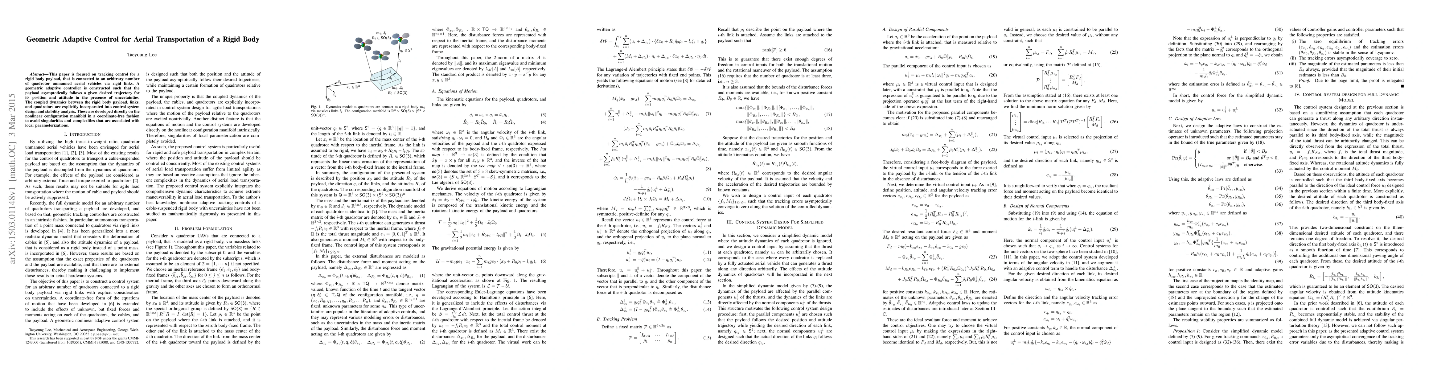 This paper is focused on tracking control for a rigid body payload, that is connected to an arbitrary number of quadrotor unmanned aerial vehicles via rigid links. A geometric adaptive controller is constructed such that the payload asymptotically follows a given desired trajectory for its position and attitude in the presence of uncertainties. The coupled dynamics between the rigid body payload, links, and quadrotors are explicitly incorporated into control system design and stability analysis. These are developed directly on the nonlinear configuration manifold in a coordinate-free fashion to avoid singularities and complexities that are associated with local parameterizations. The desirable features of the proposed control system are illustrated by a numerical example.