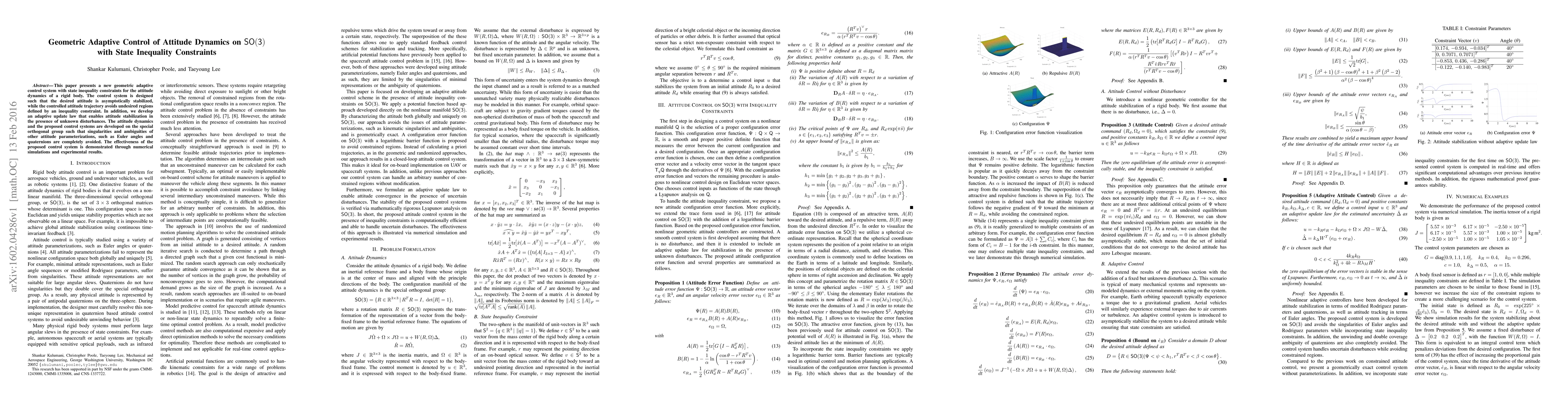 This paper introduces a geometric adaptive control system for rigid body attitude dynamics on SO(3), ensuring asymptotic stabilization of desired attitude while respecting state inequality constraints, and incorporating an adaptive update law for unknown disturbances. The approach avoids singularities and ambiguities of traditional parameterizations, validated by simulations and experiments.