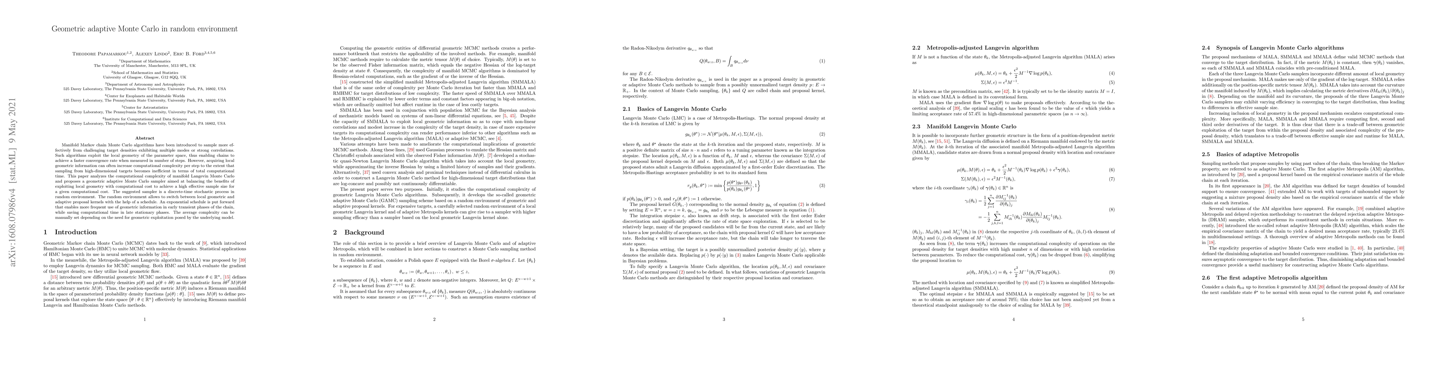 This paper proposes a geometric adaptive Monte Carlo sampler that balances the benefits of exploiting local geometry for faster convergence with computational cost, using a random environment to switch between different proposal kernels with an exponential schedule for optimal efficiency. The method aims to achieve a high effective sample size within a given computational budget.